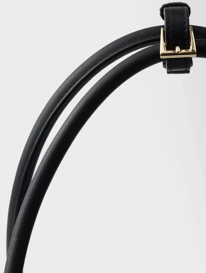 Leather handles Metal hardware Stamped lettering logo on the front Cotton lining with three pockets, including one with zipper