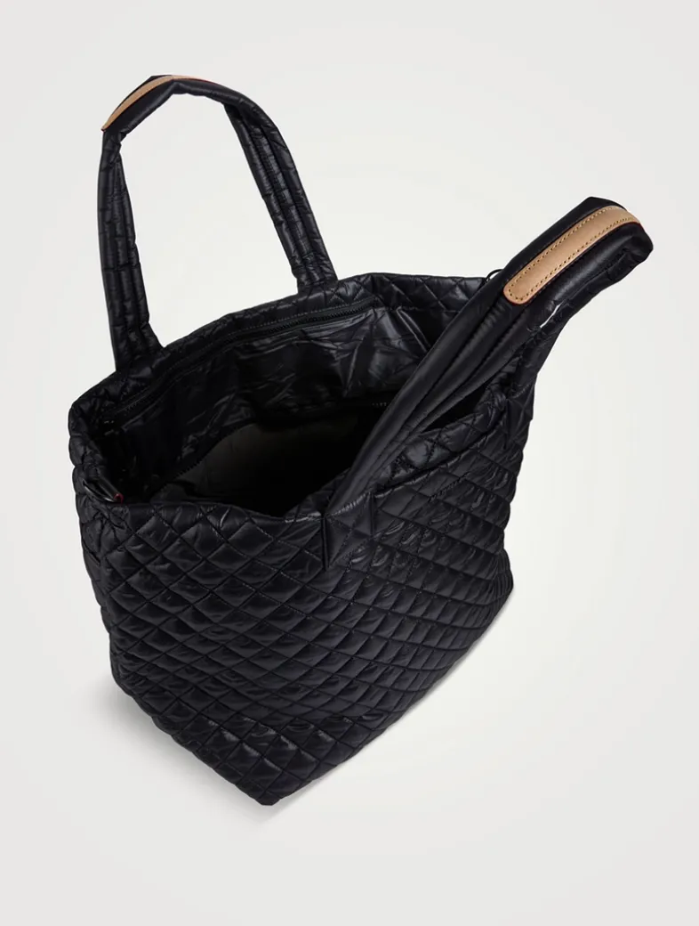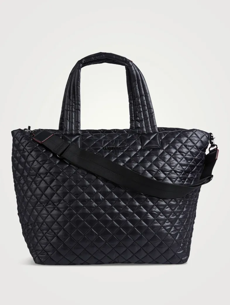 An oversized tote that’s perfect for travel, this quilted nylon design features leather-reinforced handles and an adjustable, removable crossbody strap for better portability. Five interior pockets make for perfect organization.