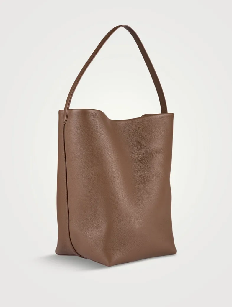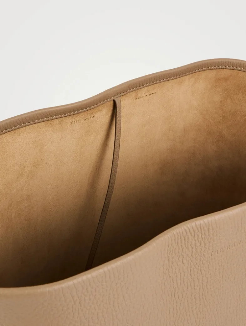 Made from tumbled grained leather with a plush suede lining, this deep tote bag is styled with a flat leather top handle for easy shoulder carry. Closed with slim knotted ties.