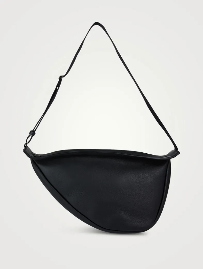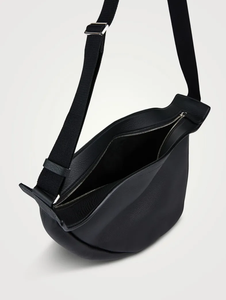 Designed in a curved shape, this spacious bag features an adjustable webbing shoulder strap for crossbody wear. It is crafted of buttery-soft Italian leather and lined with matching suede.