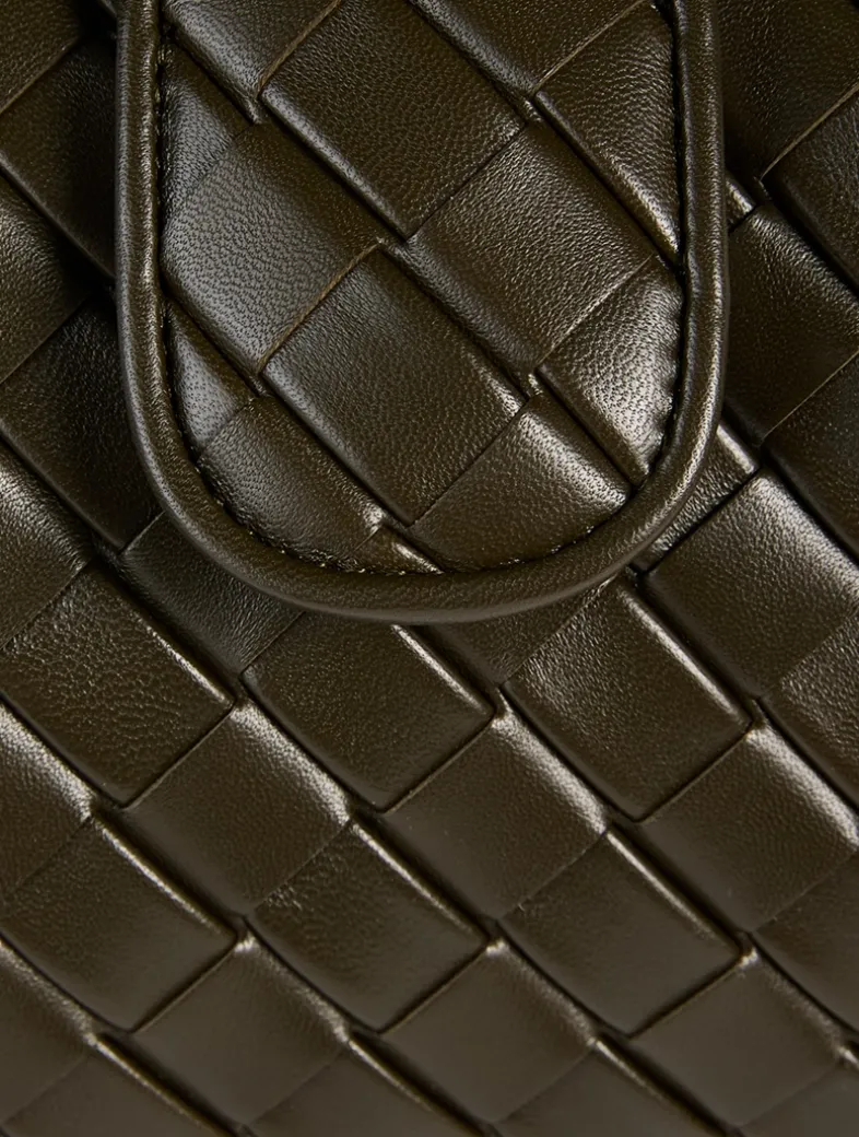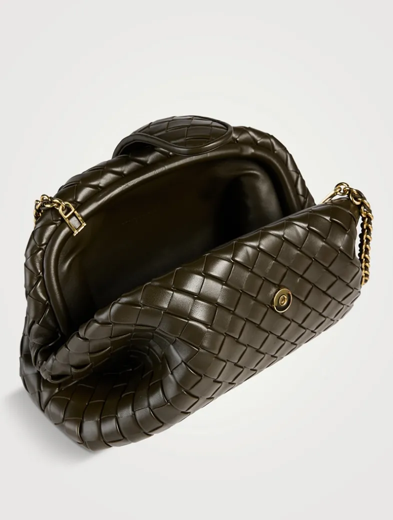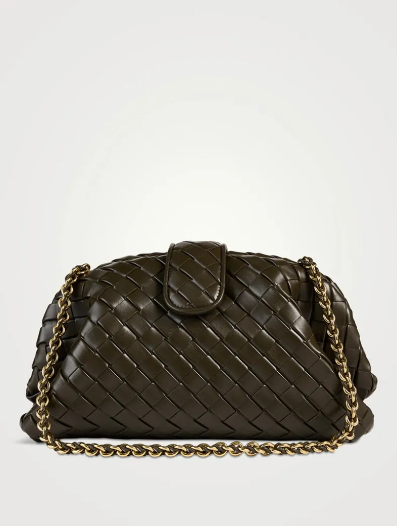 This clutch bag is intricately crafted in padded Intrecciato leather with a tubular leather braided metal chain. Inside is a single compartment.