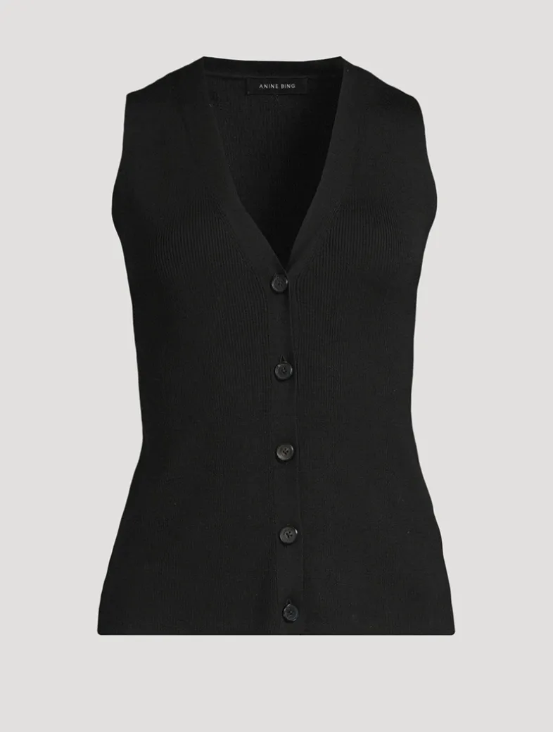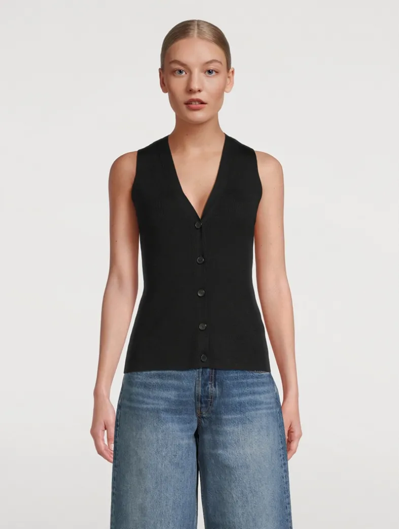 A classic sweater vest crafted from a lightweight merino wool and silk blend with ribbed structure throughout. It has a deep V-neckline, a functional front placket, and branded buttons.