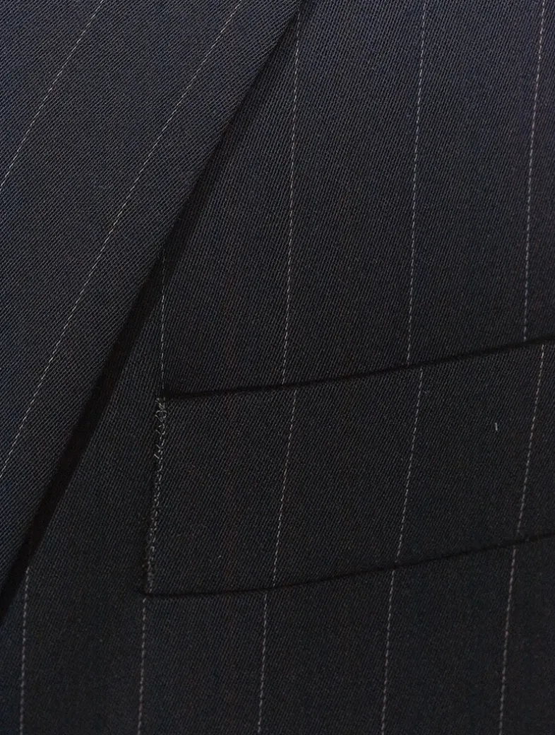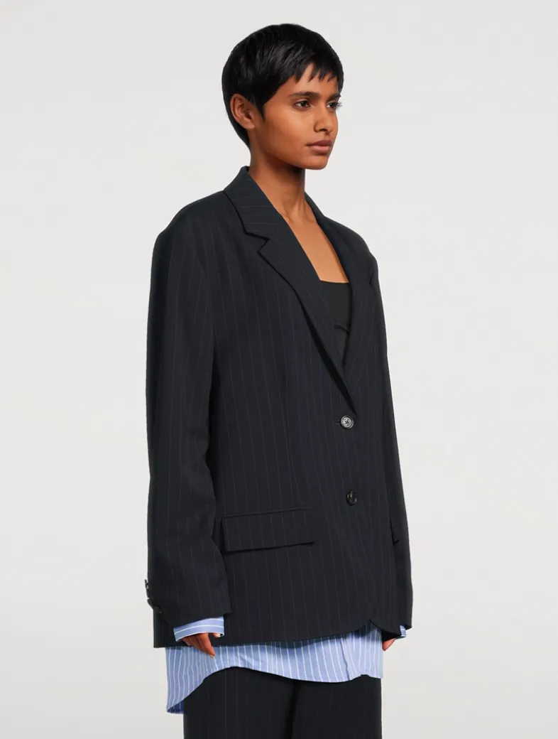 This single-breasted suit jacket is crafted from fluid fabric with layered pinstripe shirting detailing. It features a center front button closure and front pockets.