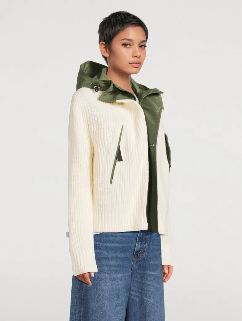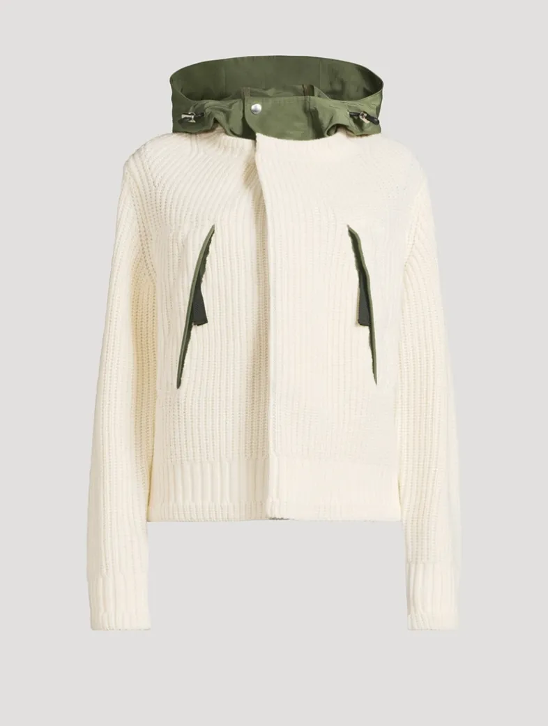 Flaunting a layered design, this long-sleeve sweater is knit from wool with a ribbed texture. It is designed with an attached hood, concealed closure, and front pockets.