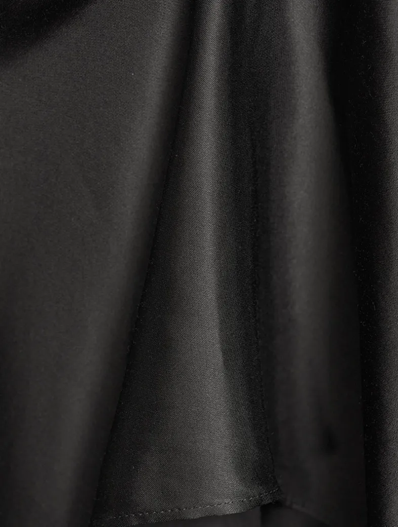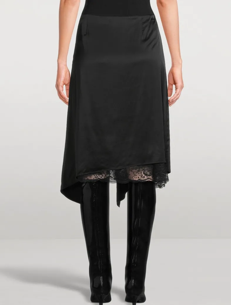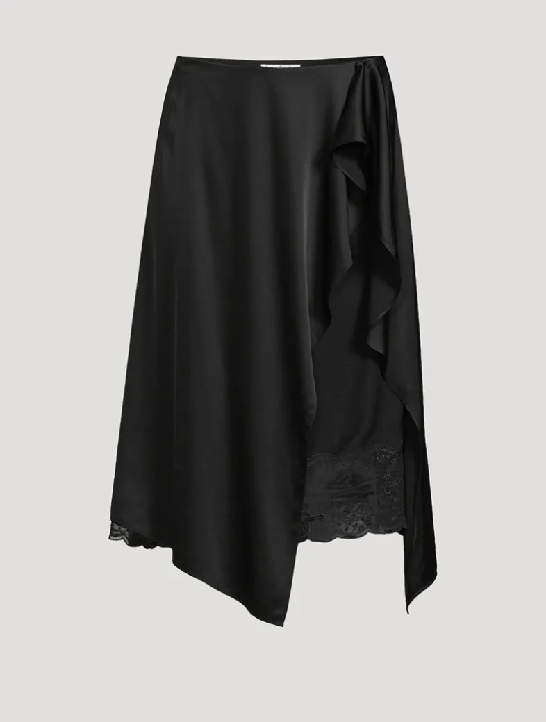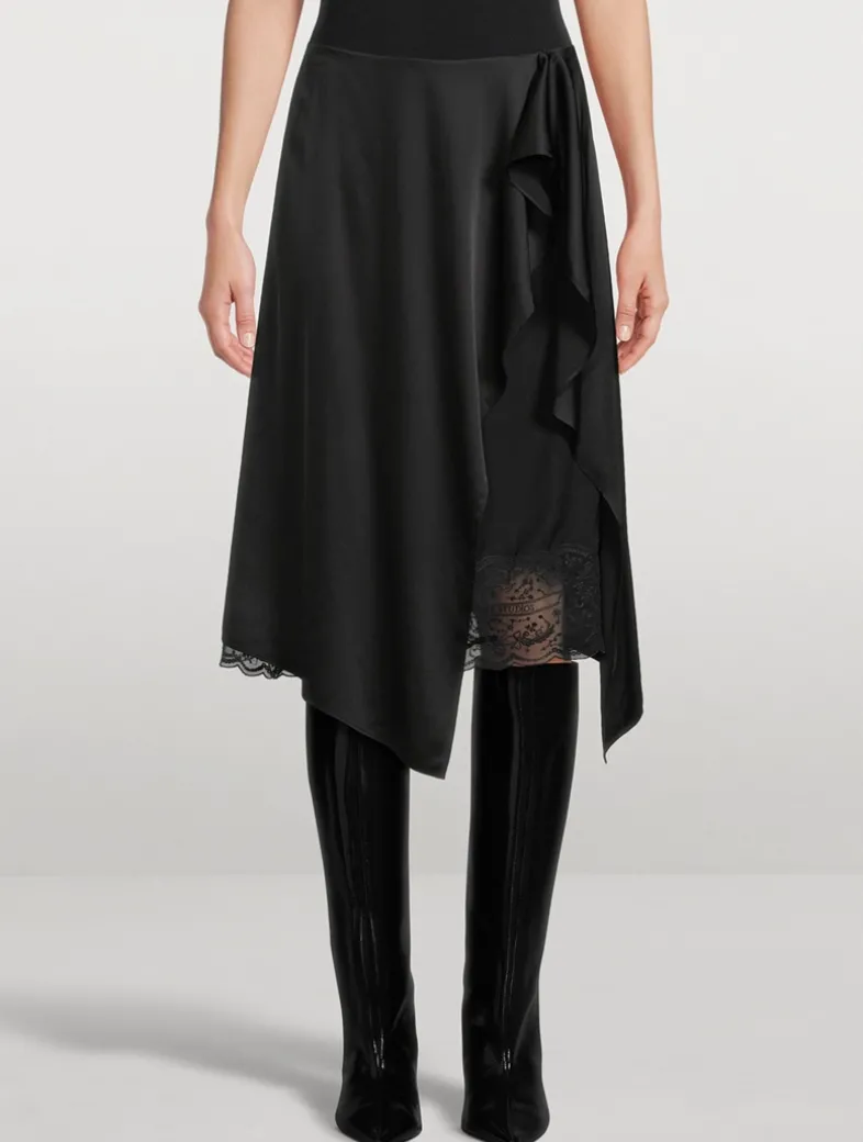 Crafted from satin with a fluid hand feel, this skirt features a ruffled layered construction detailed with a lace underlayer with hook-and-eye closure. Cut to a regular fit with a mid-waist and below knee length.