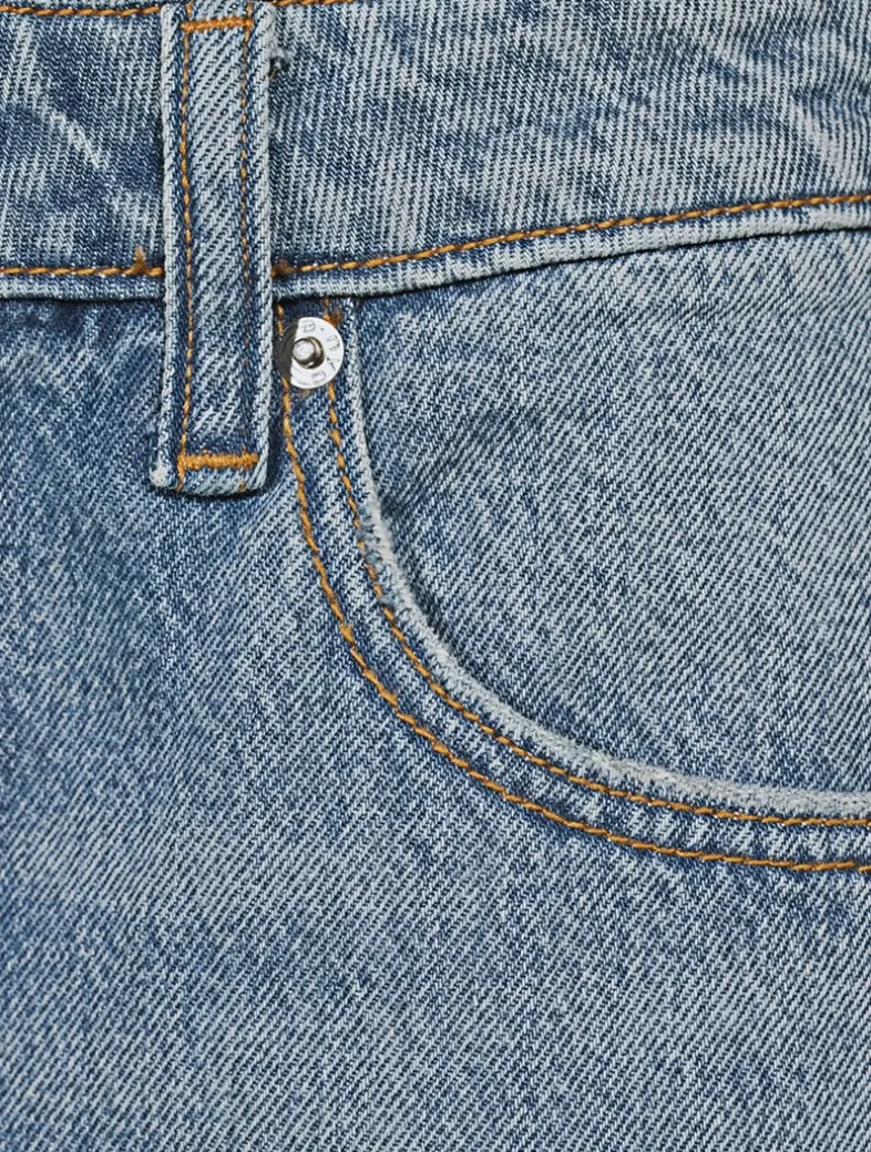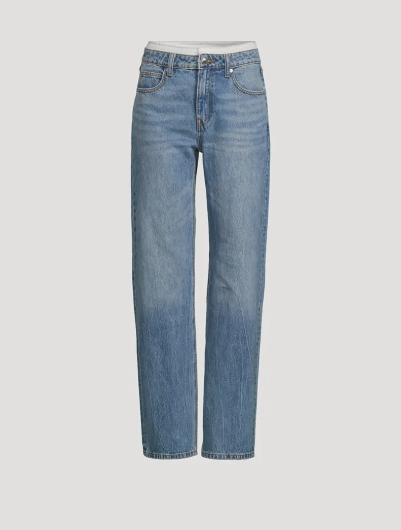These rigid denim jeans, with a pre-styled pointelle waistband, illustrates a brand-signature aesthetic. They have a relaxed top block with a straight, wide leg designed to stack on the wearer. Finished with classic five-pocket detailing and zipper fly closure.