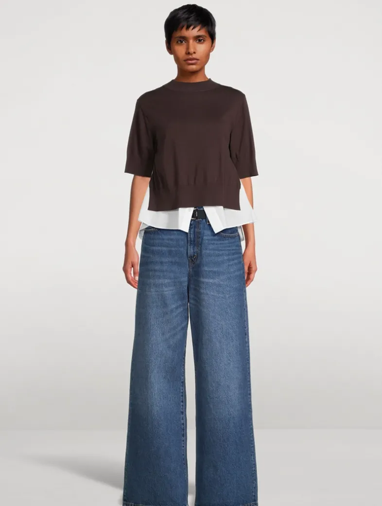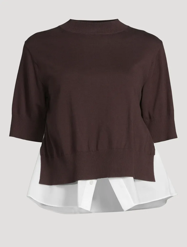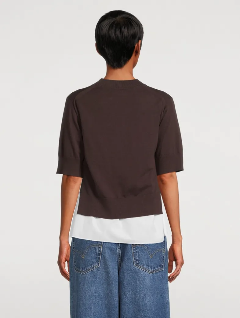Flaunting a layered design, this short-sleeve sweater with side slits has a contrasting poplin detail peeking from the hem.