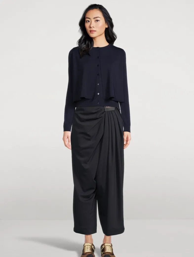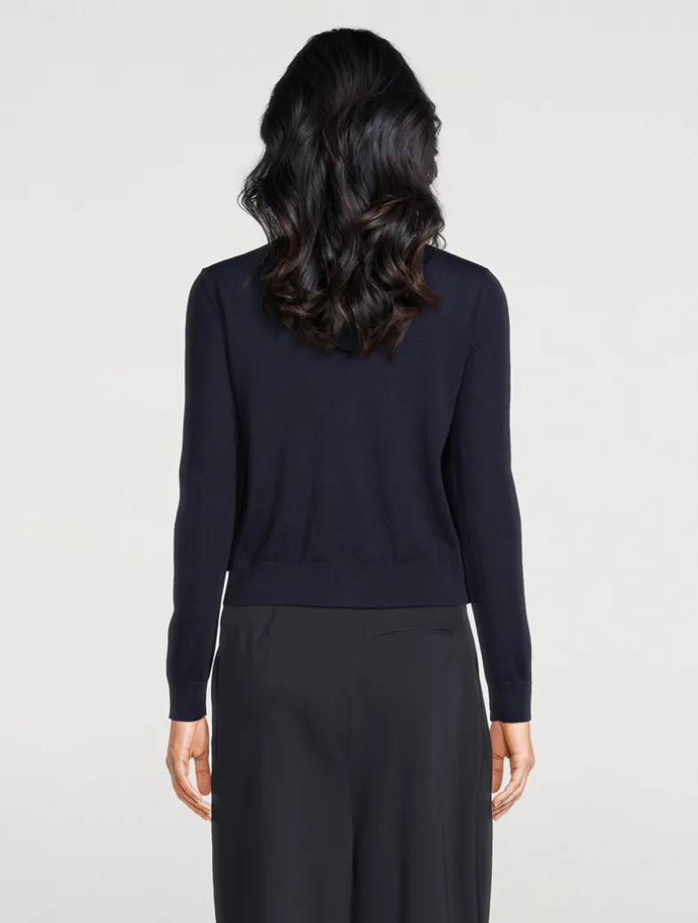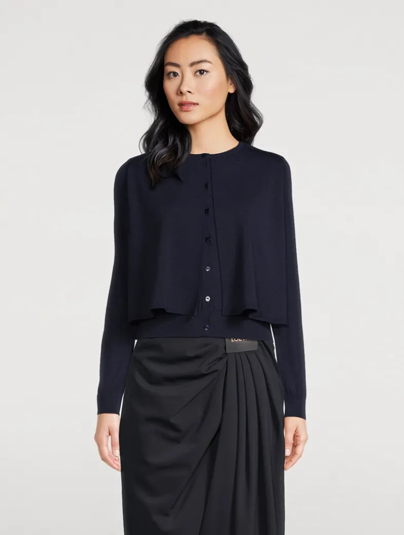 This cardigan is knit in lightweight wool featuring LOEWE’s signature trapeze silhouette with a double layer construction at the front. It has buttons lining the front and is edged with ribbed trim at the collar, cuffs, and hem.