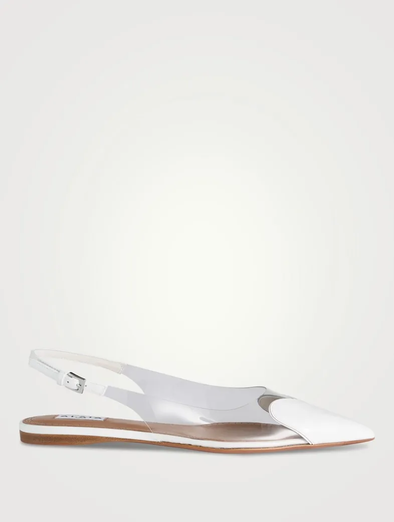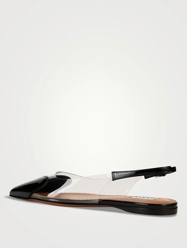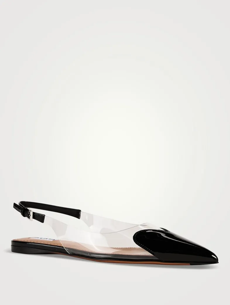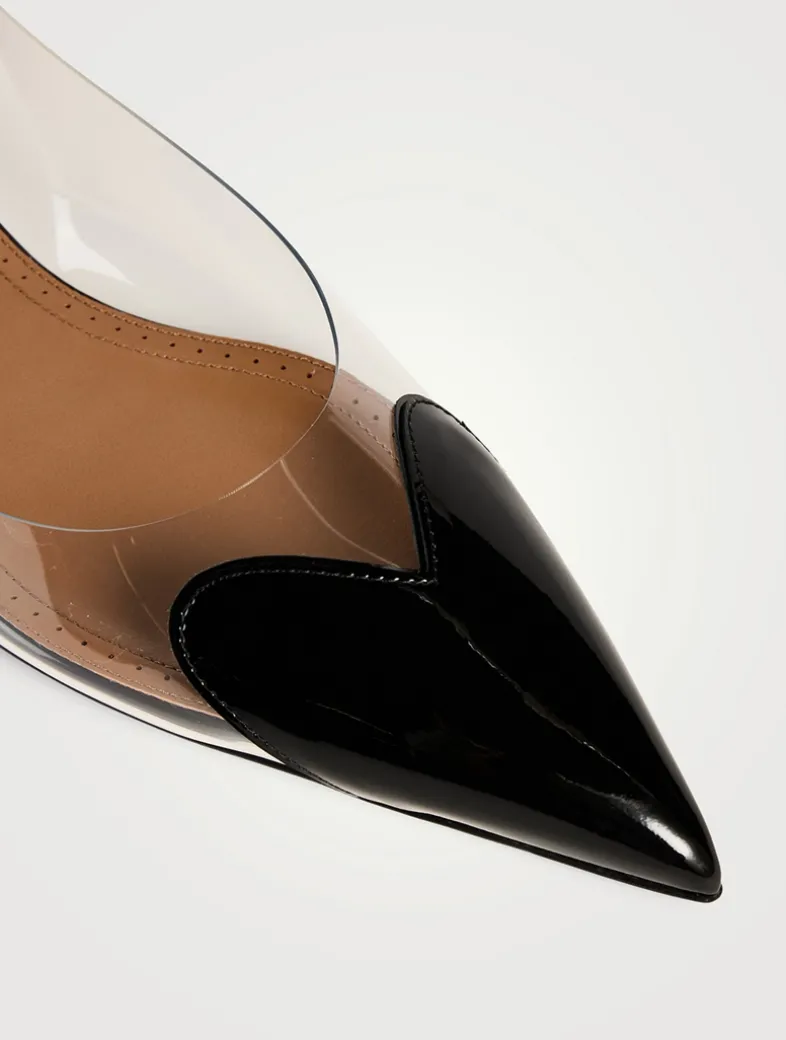 These pumps are detailed with a patent leather heart at the vamp, highlighting the point-toe design of this pair. They are finished with an adjustable slingback strap.