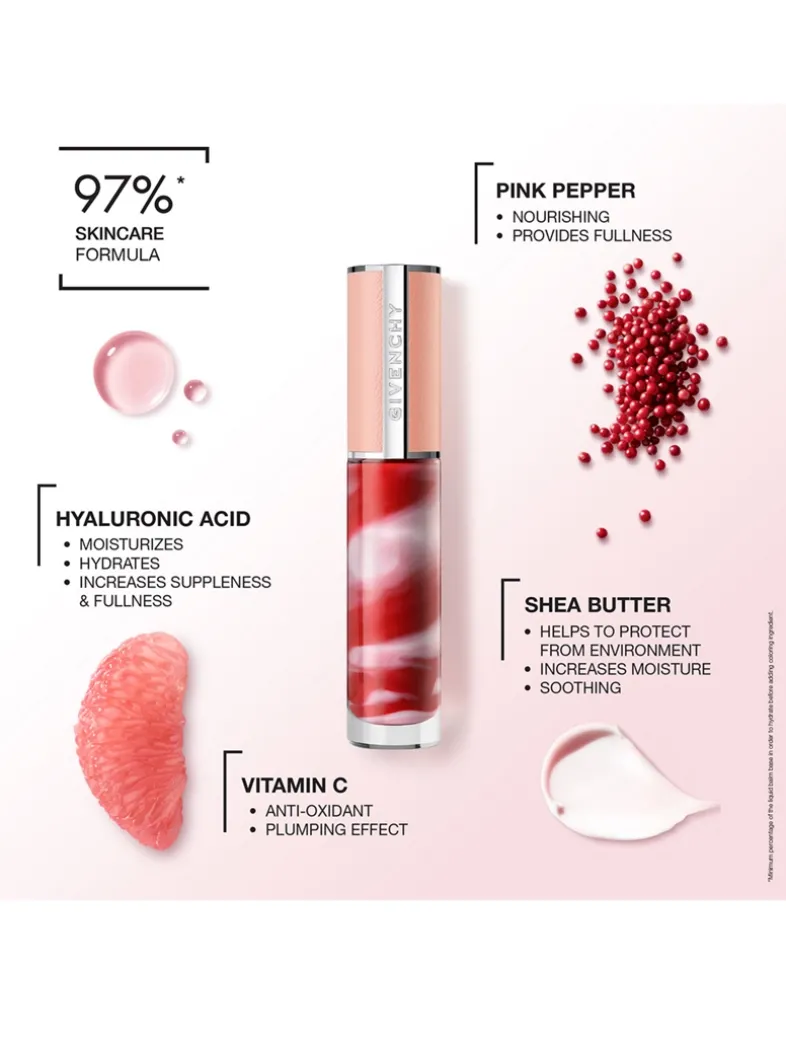 Care for your natural glow with the first marbled couture liquid lip balm, infused with colour and care. The enveloping marbled texture of Rose Perfecto Liquid Lip Balm swathes lips in moisturizer-infused colour. Its hydrating and comfortable formula is enriched with hyaluronic acid, vitamin C, shea butter, and pink pepper for a nourishing, smoothing, and plumping effect. Day after day, lips are soothed, moisturized, and radiantly healthy. This new marbled formula is encased in an innovative vegan cactus leather case made by a Mexican eco start-up, for the first time in make-up history. Rose Perfecto Liquid is also the first Givenchy liquid balm with a high-quality recyclable glass bottle. Lips are instantly beautified thanks to the immediate plumping effect and ultra-caring creamy texture. Swathed in 24-hour hydration, the lips are nourished and protected from dryness every day. The new marbled moisturizer formula is infused in colour and care to tint the lips with a couture range of fresh shades. The light coverage brings a healthy glossy finish. Iconic shades 001 and 011 adapt to the pH of the lips to create a unique, made-to-measure finish.