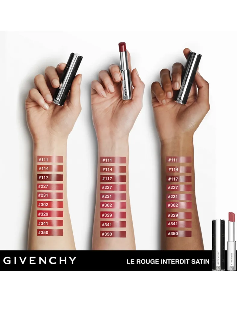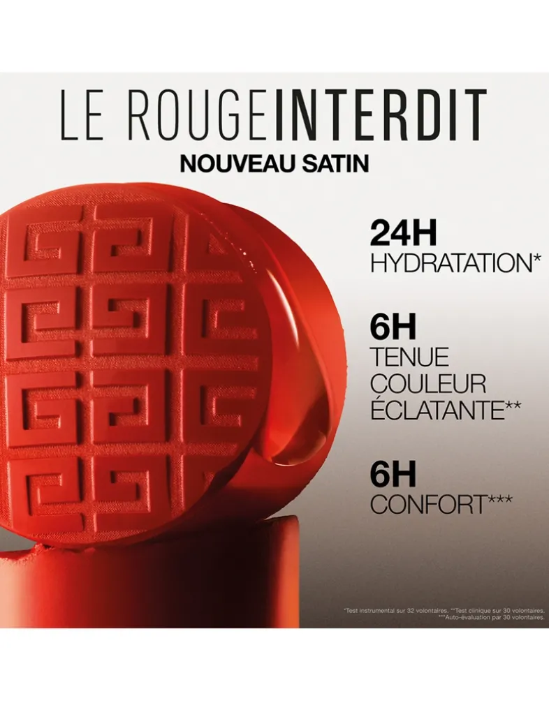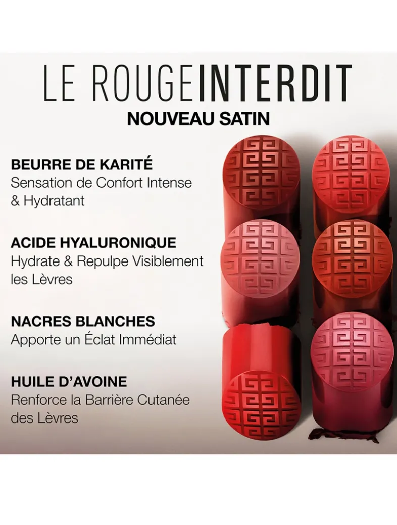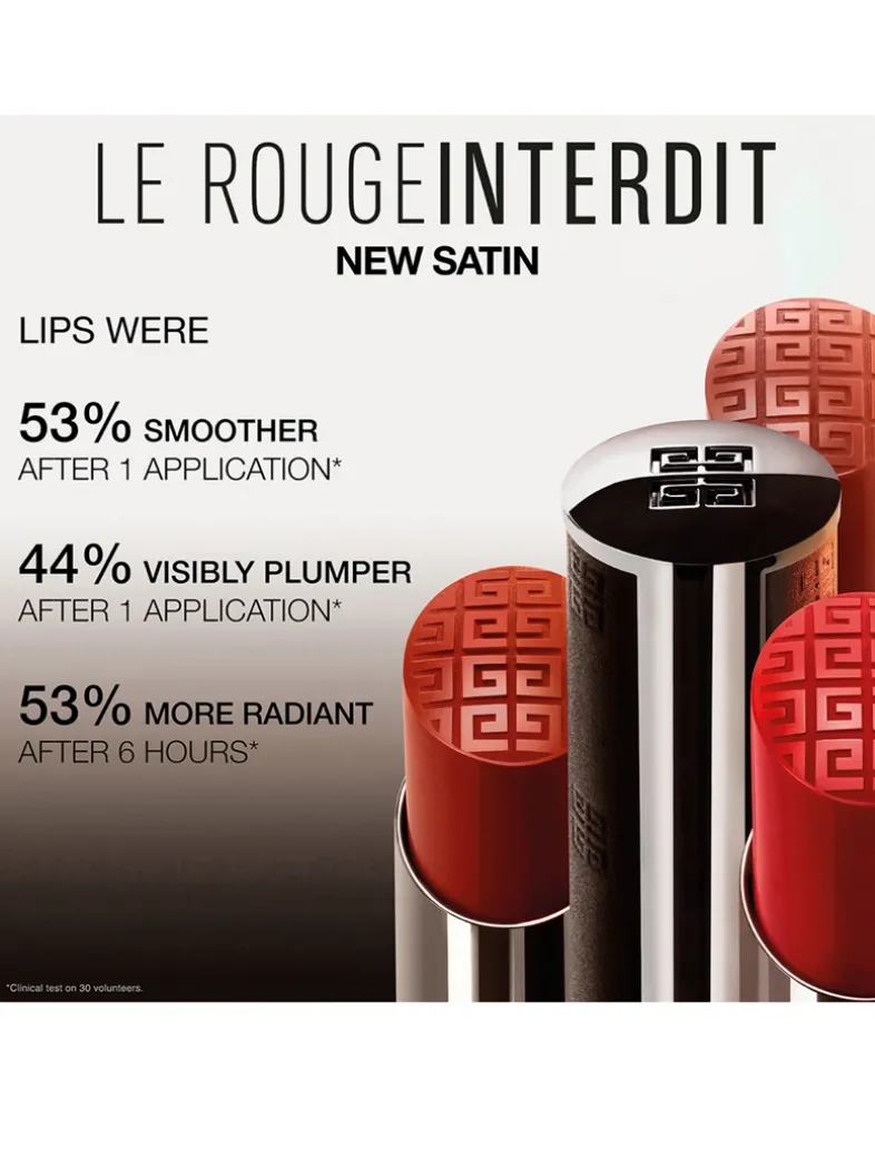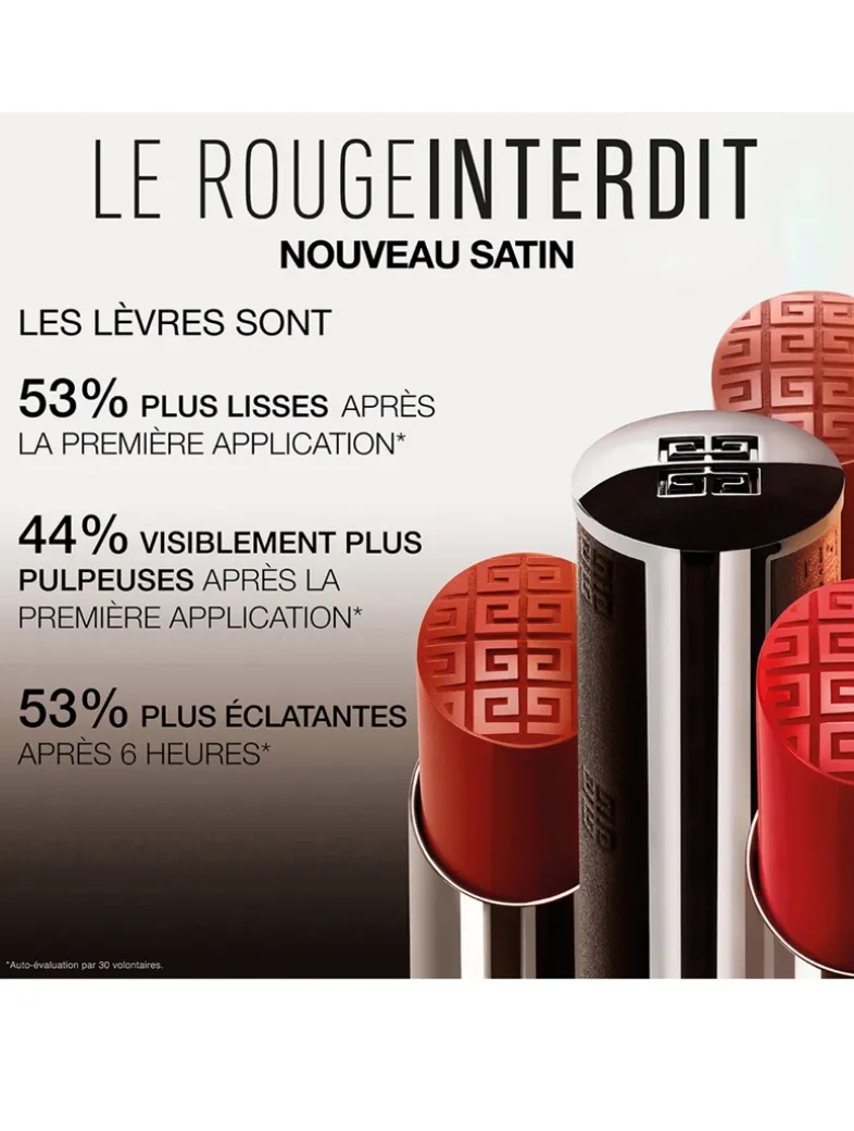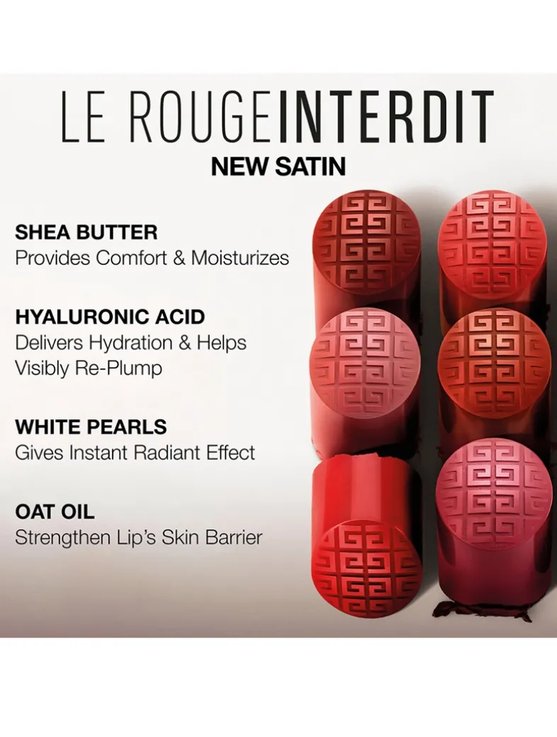 What it does: Experience hydrated, plump lips with the long-lasting, comfortable formula of Le Rouge Interdit Satin Lipstick. Infused with Hyaluronic Acid for hydration, shea butter for smoothness, and white pearls for radiance.