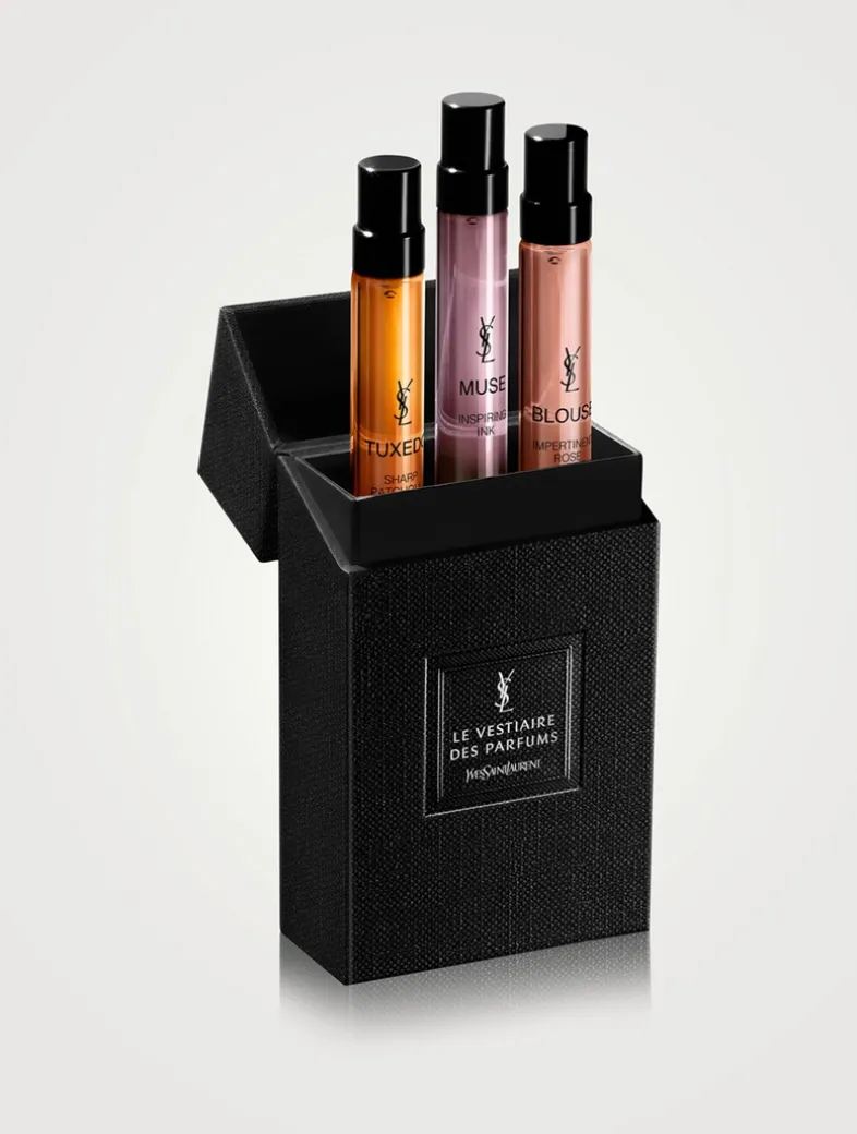 Le Vestiaire des Parfums Collection Essentielle Discovery Set includes Tuxedo, Blouse, and Muse Eau de Parfum (3 x 10 ml). This set features iconic couture pieces and inspirations crafted by renowned perfumers. Experience the unique haute parfumerie wardrobe embodying Yves Saint Laurent’s style and spirit. Each scent interprets the couturier’s legendary designs and materials. Discover Yves Saint Laurent’s essence with this exquisite Discovery Set.