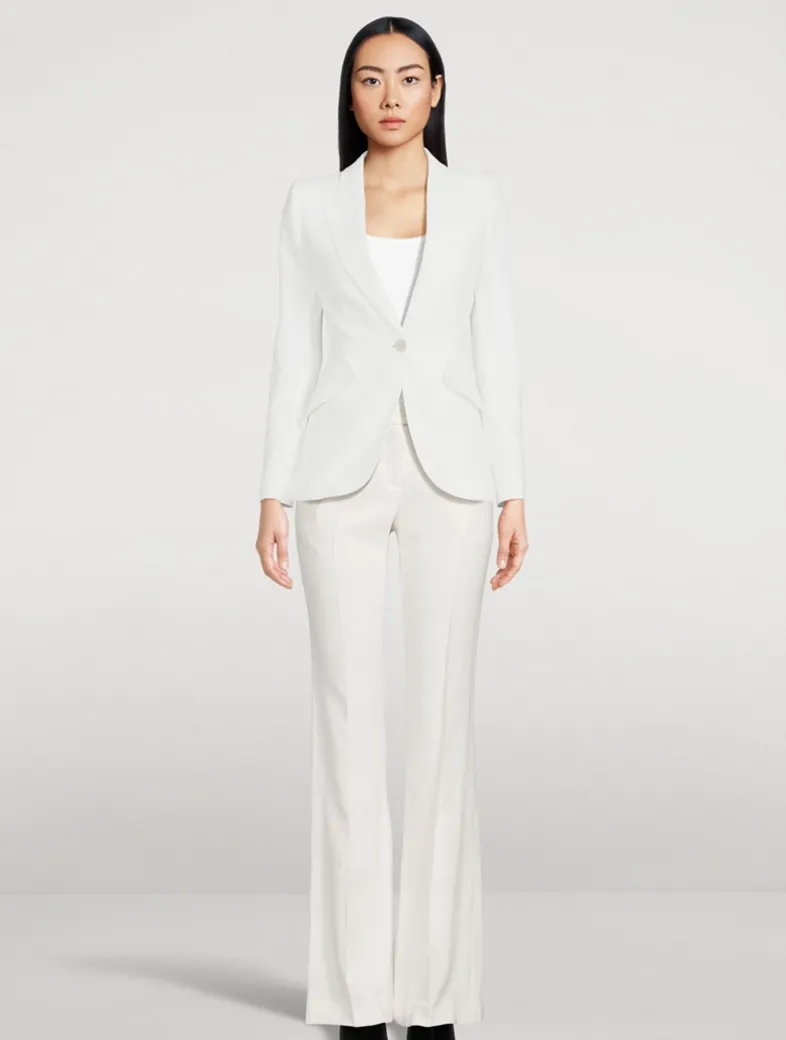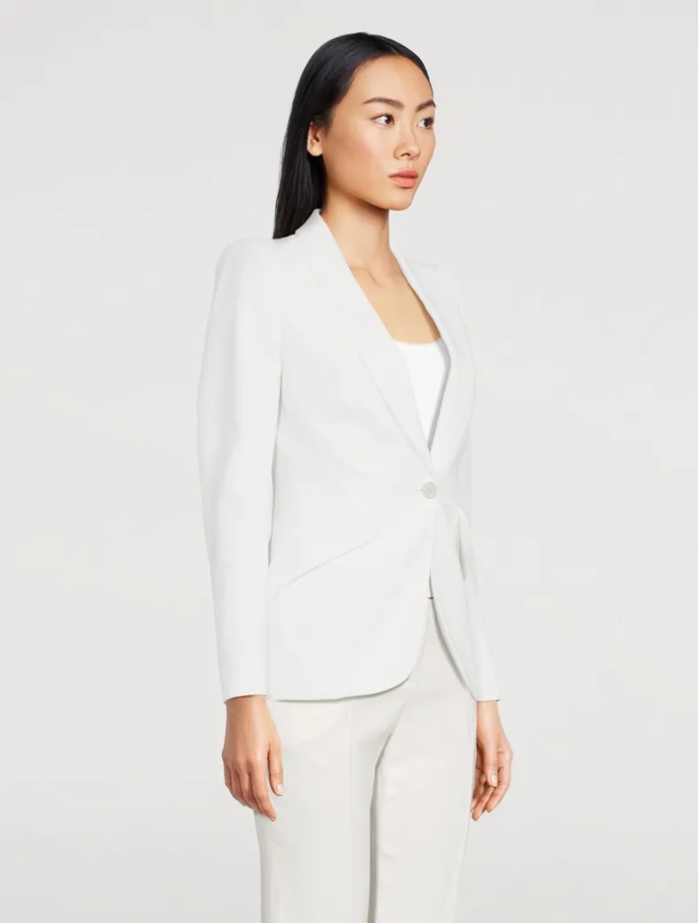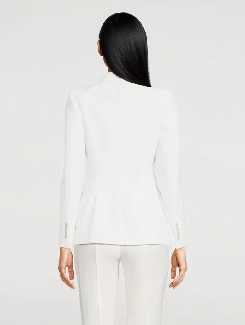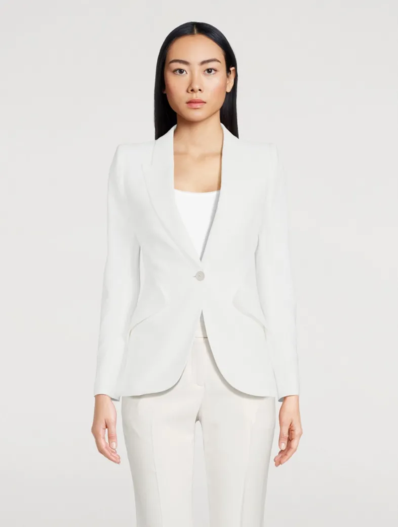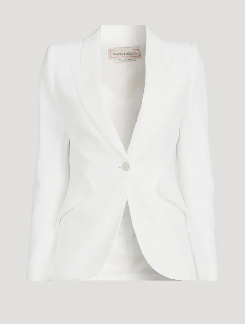 Crafted of a leaf crêpe, this fully-lined jacket has peaked shoulders with subtle padding that falls to a nipped-waist body. A classic tailored style for the McQueen house, the topper has a single button fastening, two side flap pockets, buttoned cuffs, and a pair of back vents.