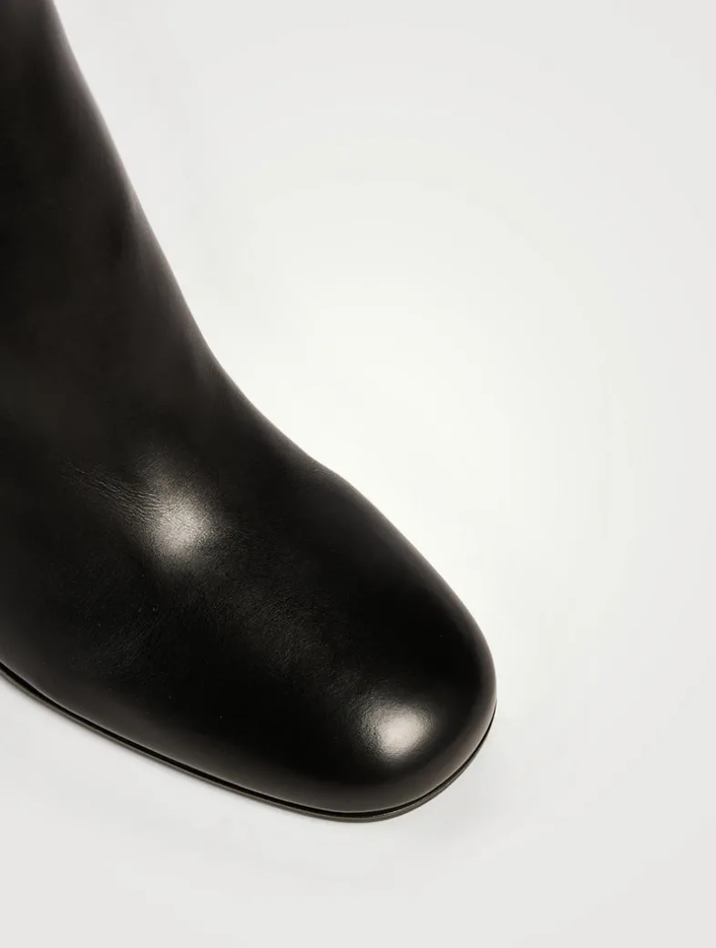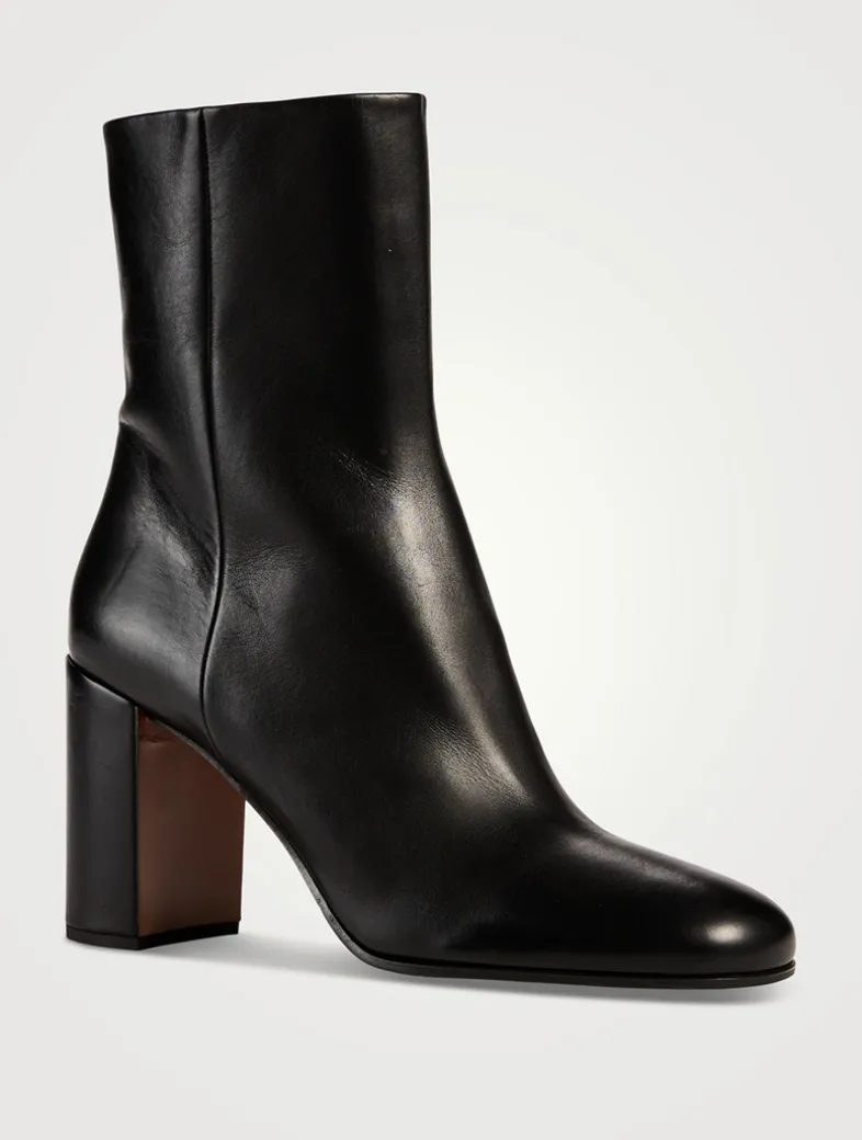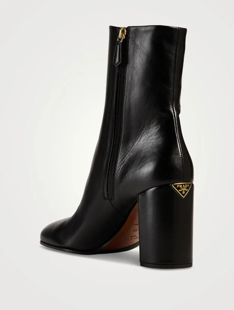 These luxe leather ankle boots are embellished with Prada’s signature triangular medallion at the top of the heel. They are designed with a rounded square toe, side zipper, and are set on a chunky block heel.