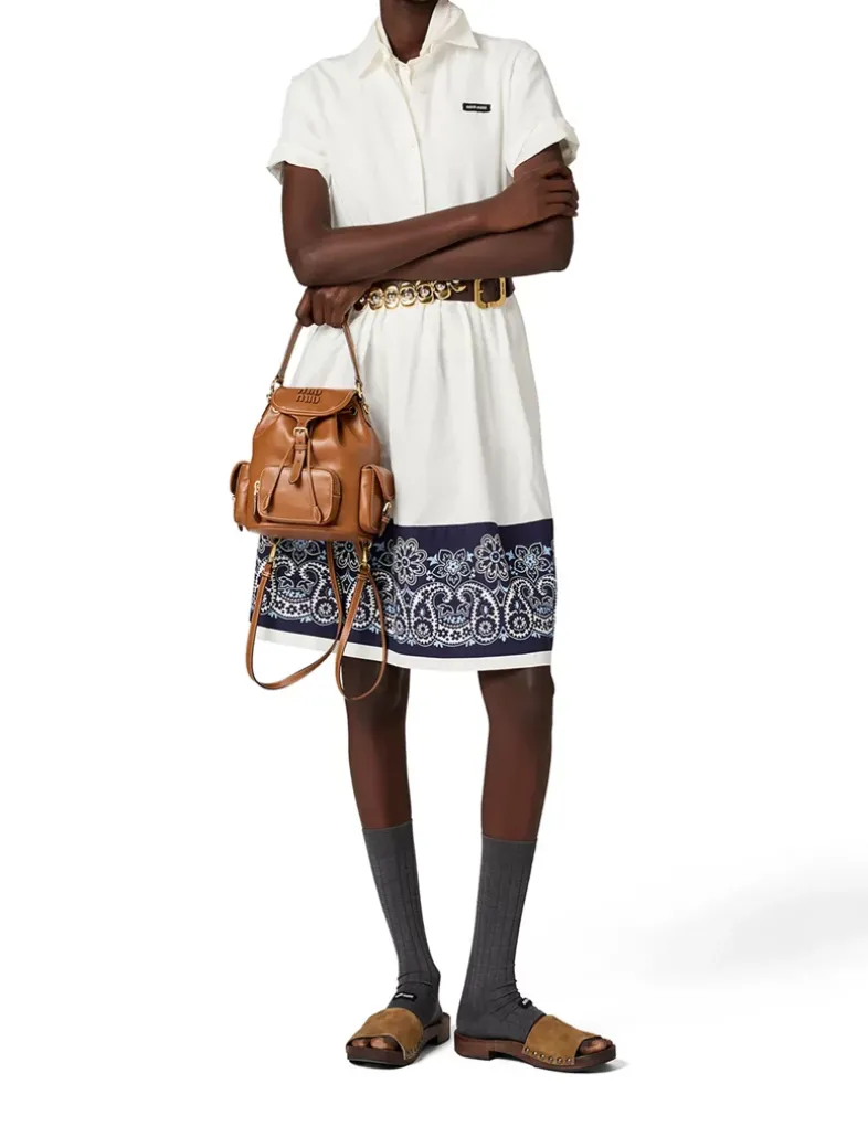 Leather handle Front zipper pocket Side flap pockets Gold-tone hardware Flap closure with buckle Linen blend interior with patch pocket Backpack can be worn two ways: classic harness with straps, minimum length 65 cm, maximum length 68 cm, or crossbody strap, length 110 cm – drop 53 cm Leather lettering logo on the flap