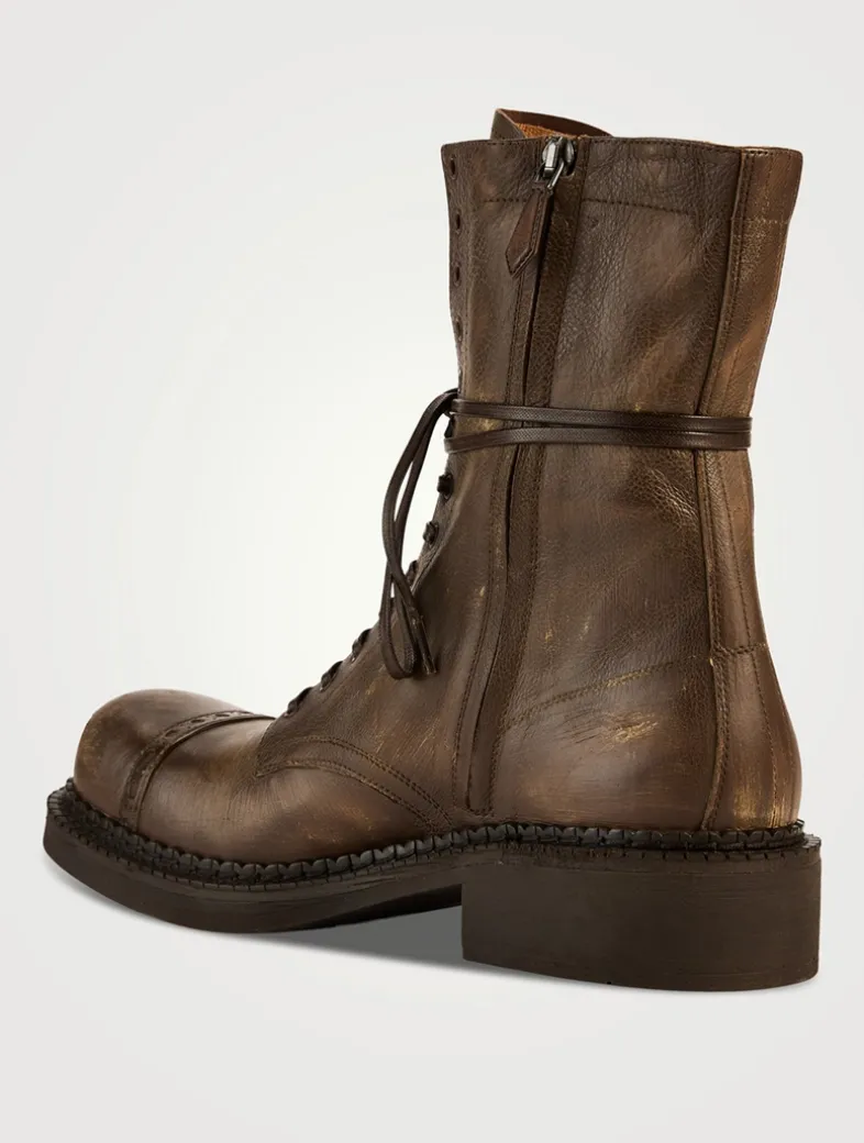 These sleek leather boots that nod to menswear-inspired styles are characterized by the perforated motif on the upper, the laces wrapped around the boot, and the Miu Miu logo on the tongue.