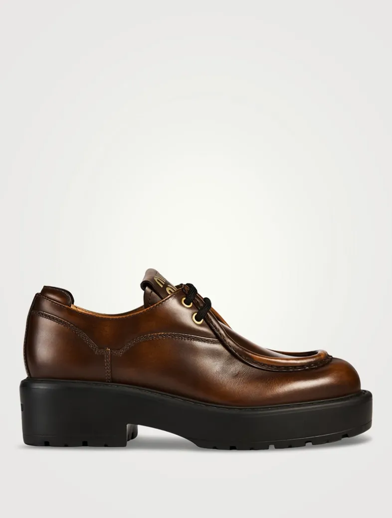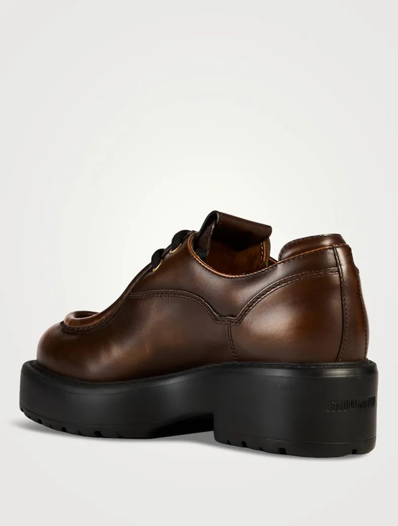 A special two-tone nuanced effect, the result of a sophisticated process that distributes wax in an uneven way, characterizes these leather lace-up shoes. The Miu Miu logo completes the look with an iconic note.