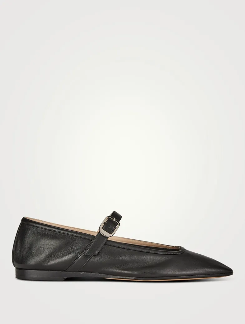 A buttery-soft leather construction defines these flats. The ballerinas have a rounded square toe and an adjustable Mary Jane-style strap in a grained finish.