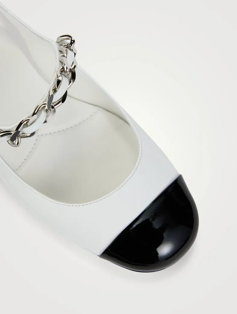 Playing with the iconic two-tone design and classic taste, Miu Miu presents a new version of the pump with a sophisticated yet provocative character. The captivating metal chain is combined with the pearl, which evokes traditional style, while the structured heel and slingback style recall a retro world. Thanks to its design, the shoe enters the woman’s feminine wardrobe, subverting conventional rules of style.