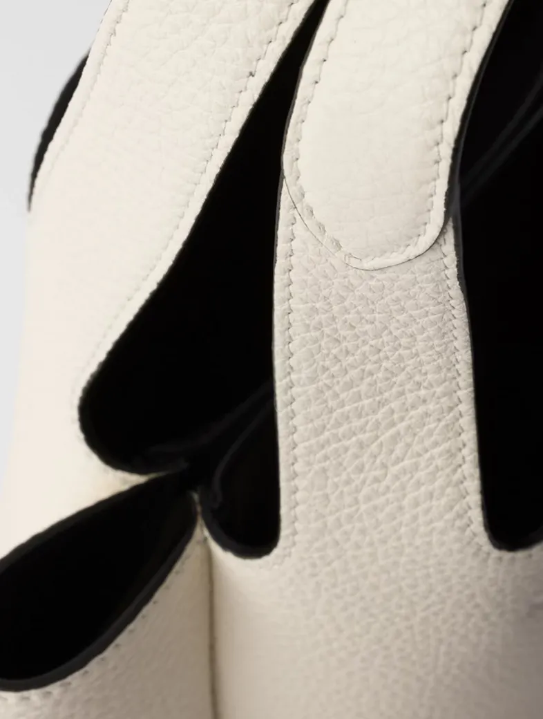 Leather handles Metal hardware Metal lettering logo on the front Magnetic flap closure Nappa leather lining with three compartments