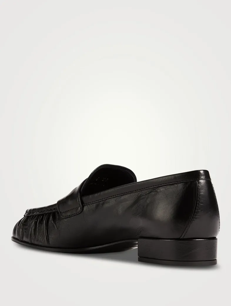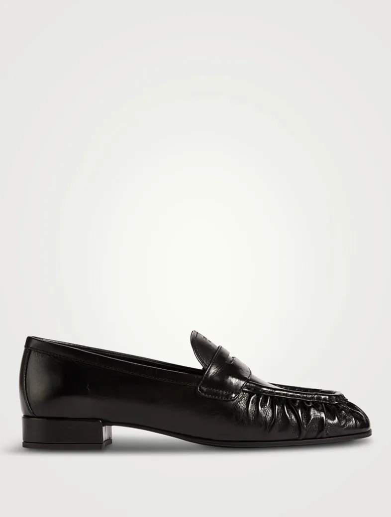 Crafted from leather, these classic penny loafers have a low block heel and a square toe with gathered detailing.