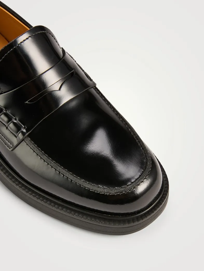 Exuding a preppy look, these loafers in calfskin leather are finished with penny bar detailing. Featuring a side band with Tod’s logo, they come with a rubber outsole with embossed rubber pebbles.