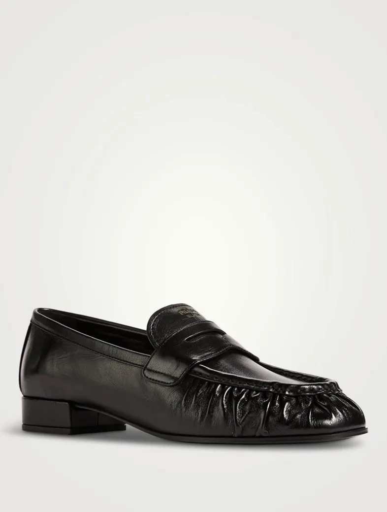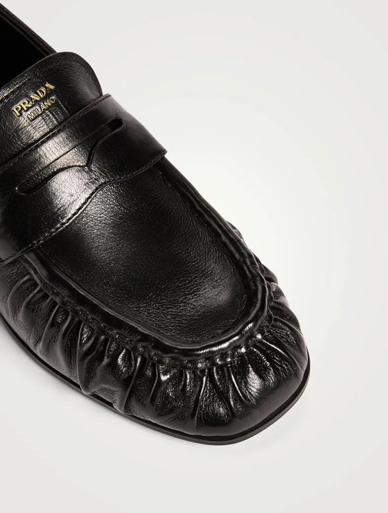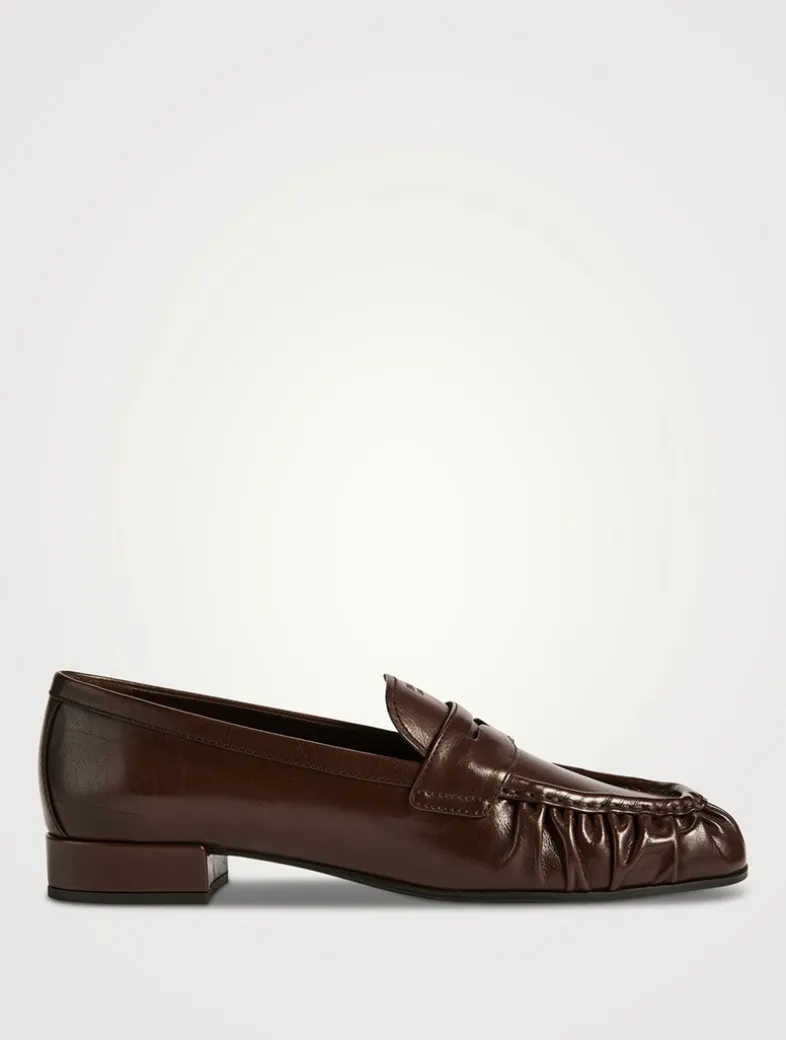 Crafted from leather, these classic penny loafers have a low block heel and a square toe with gathered detailing.