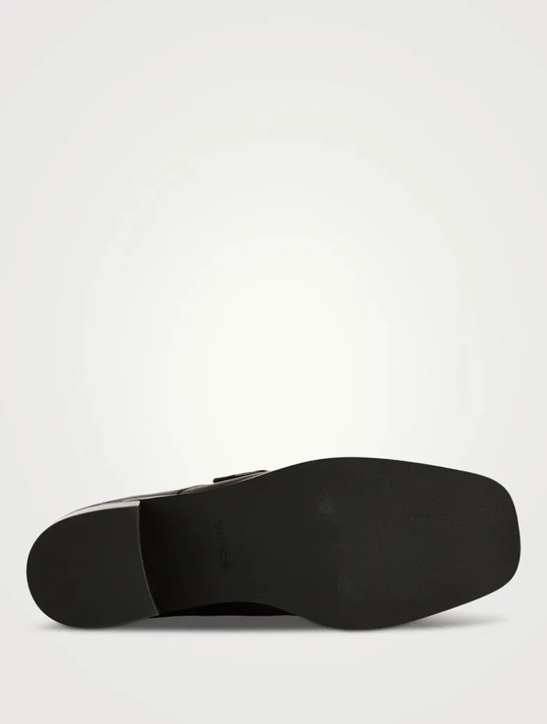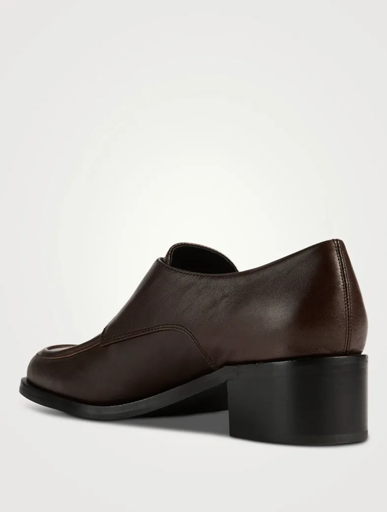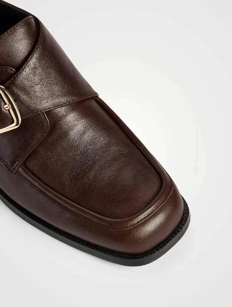 Seamlessly blending feminine and masculine elements, this leather monk-strap loafer is set on a stacked block heel and finished with a modern squared apron toe.