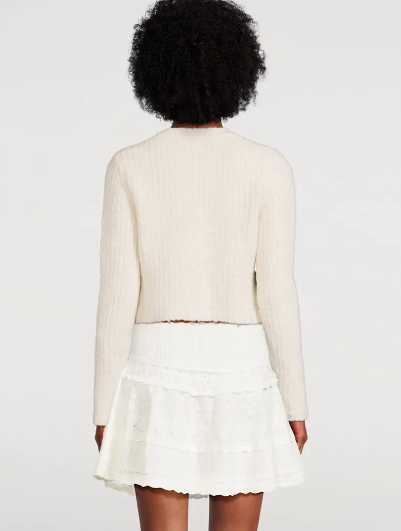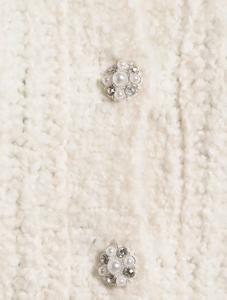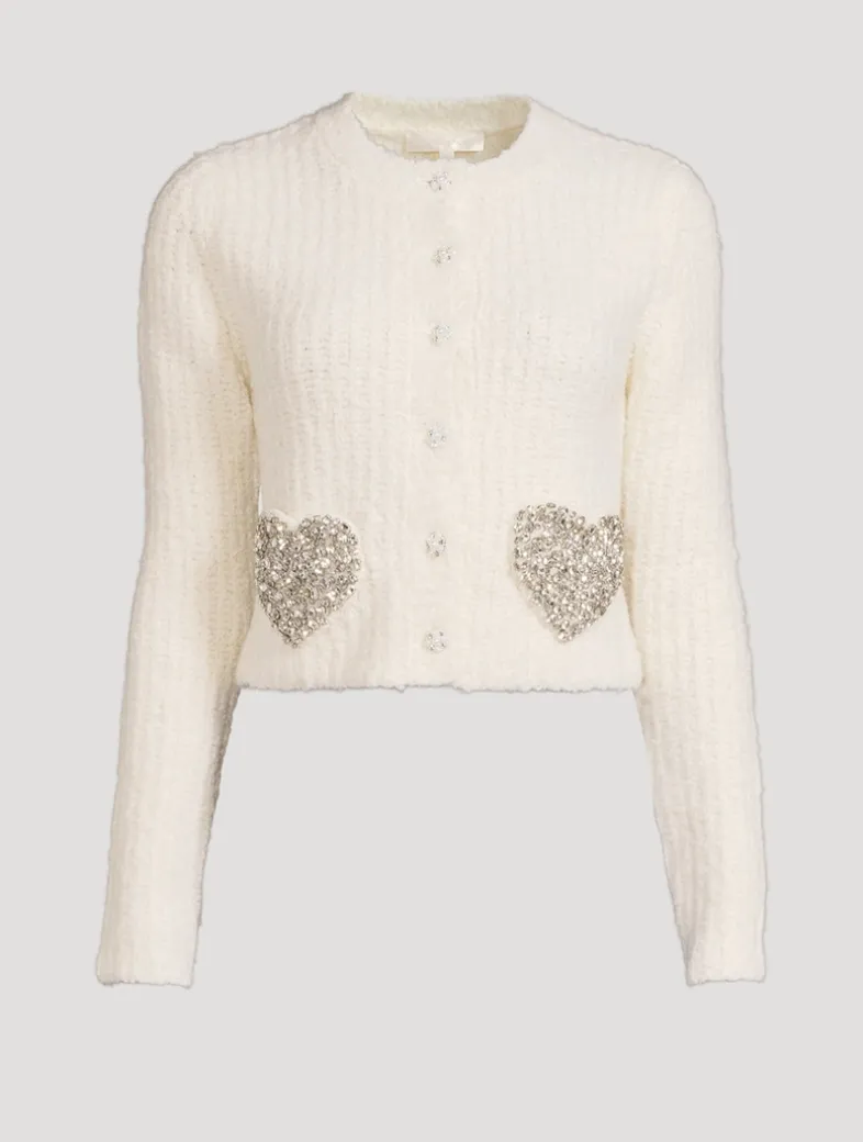 This gorgeous knit is designed from a warm, wool bouclé blend giving it an extra cozy look and feel. The cardi features crystal-embellished heart-shaped pockets at the front for a playful touch as well as pearl-and-crystal novelty buttons down center front.