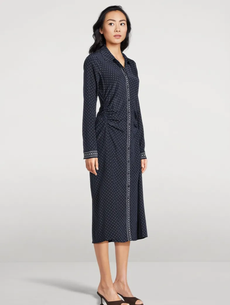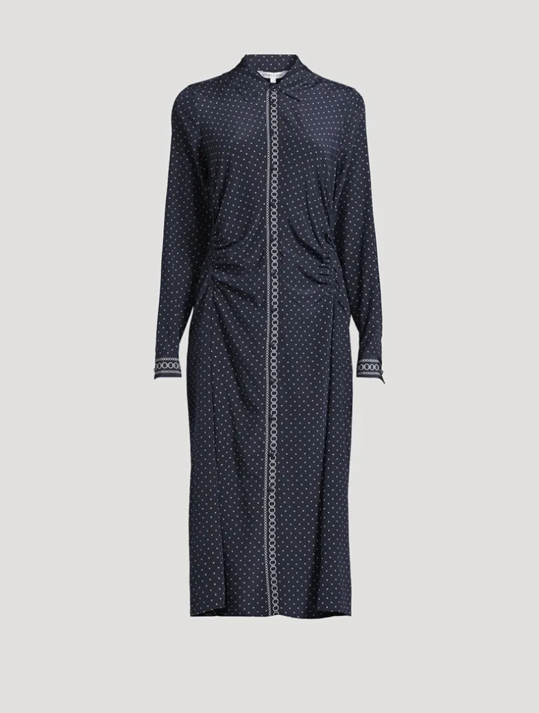 Expertly tailored from premium stretch silk, the Lex dress is an elegant take on the wardrobe classic. The midi style features ruching on the sides, a beautiful drape, and a decorative trim of trompe l’oeil chain-links against polka dots.