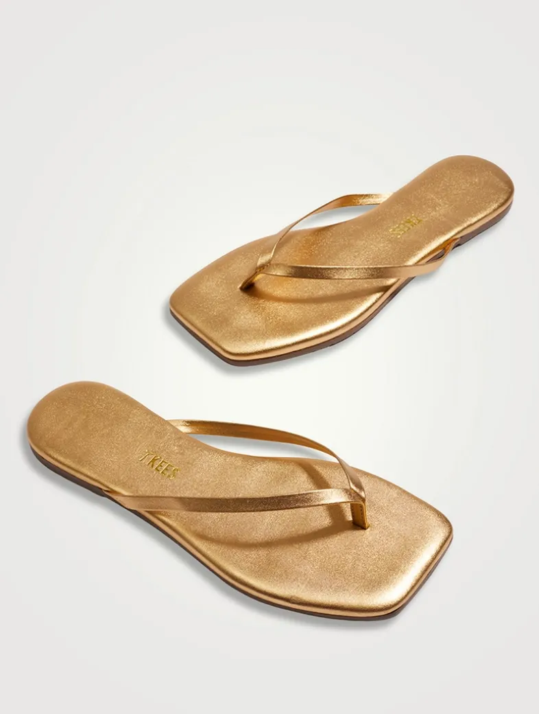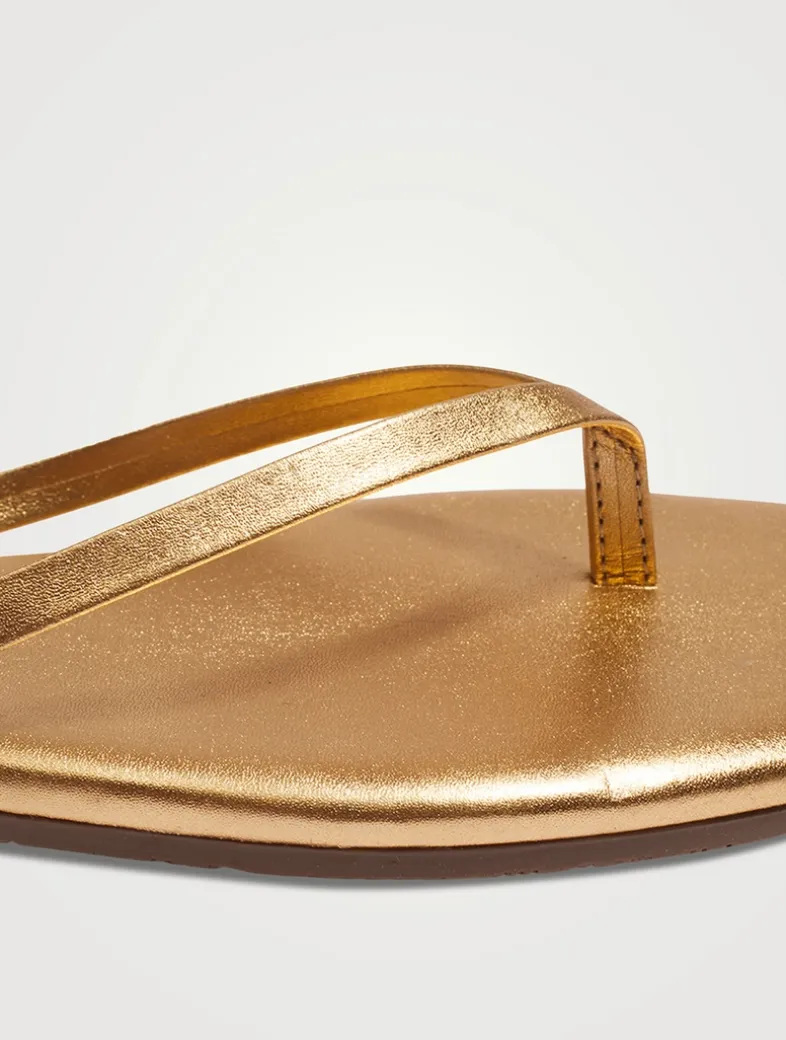 A squared-off toe defines these thong sandals, which are crafted from metallic leather with a rubber sole.