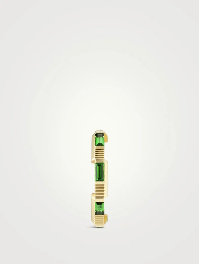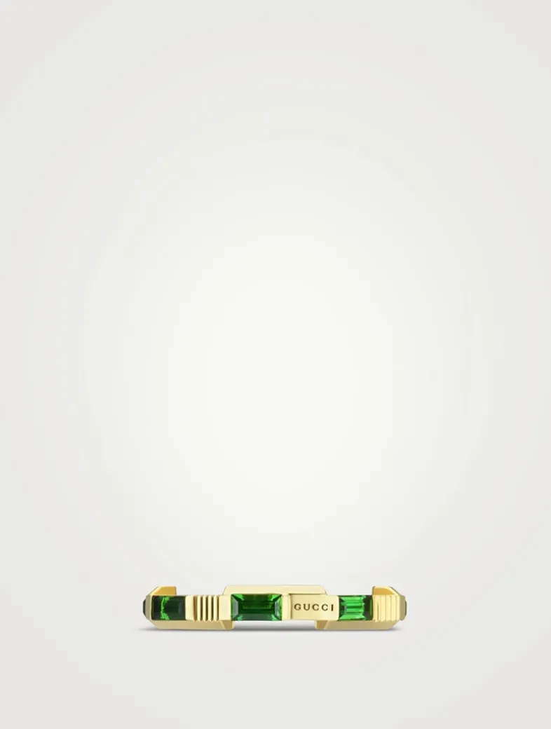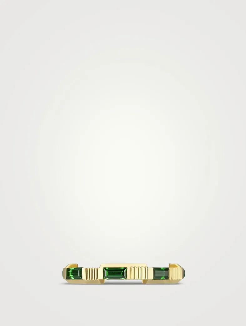 An exploration of modern romance, the GUCCI Link to Love collection reinterprets classic symbols of love. Designed with a stackable mechanism, this striped 18k gold ring is dotted with baguette cut green tourmaline. GUCCI logo lettering finishes the piece.