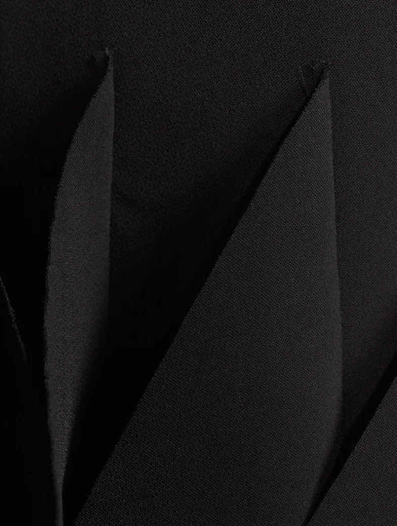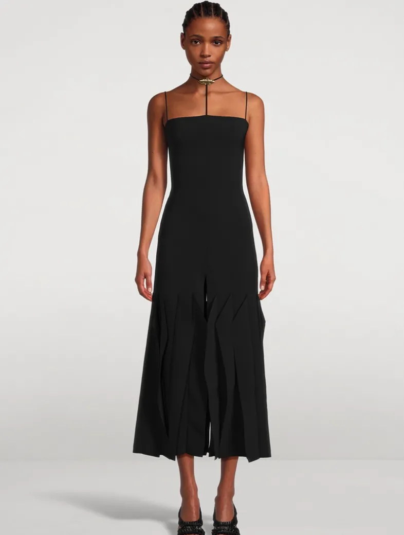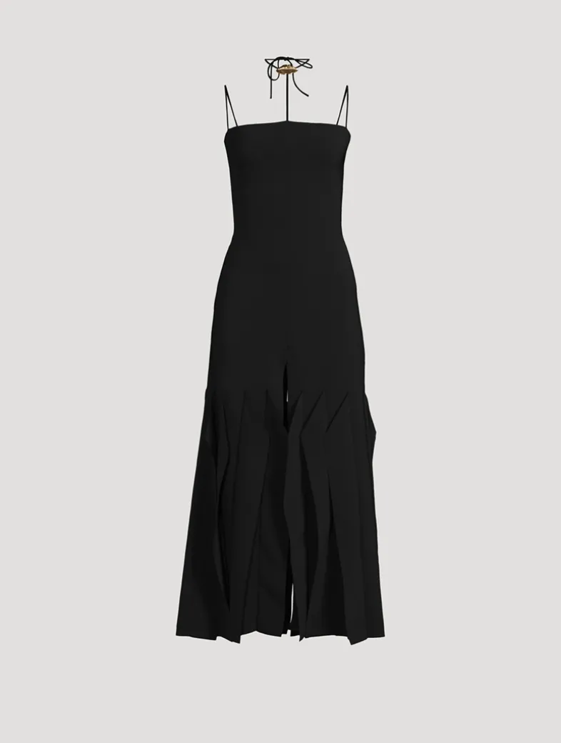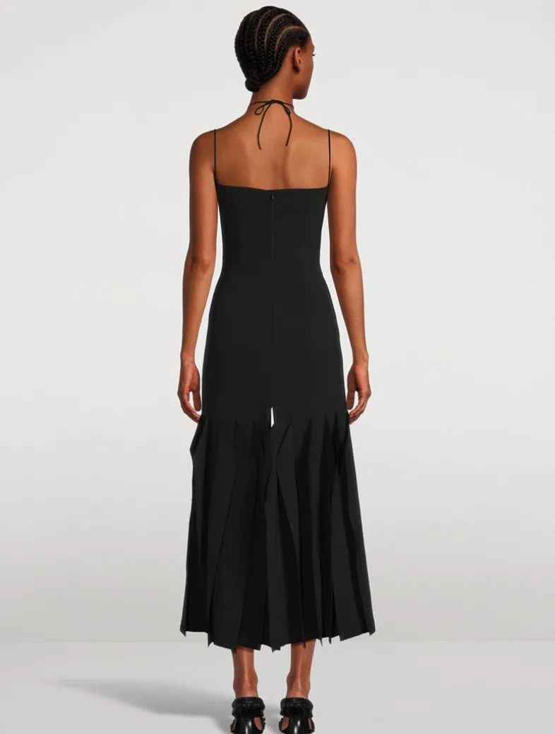 This dress brings a chic elegance with a bold choker neckline adorned with a gold-tone lip motif. Its sleek, figure-flattering silhouette is finished with fine straps and pleated panels at the hem. A tie and concealed zip secure the back.