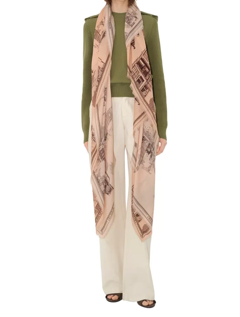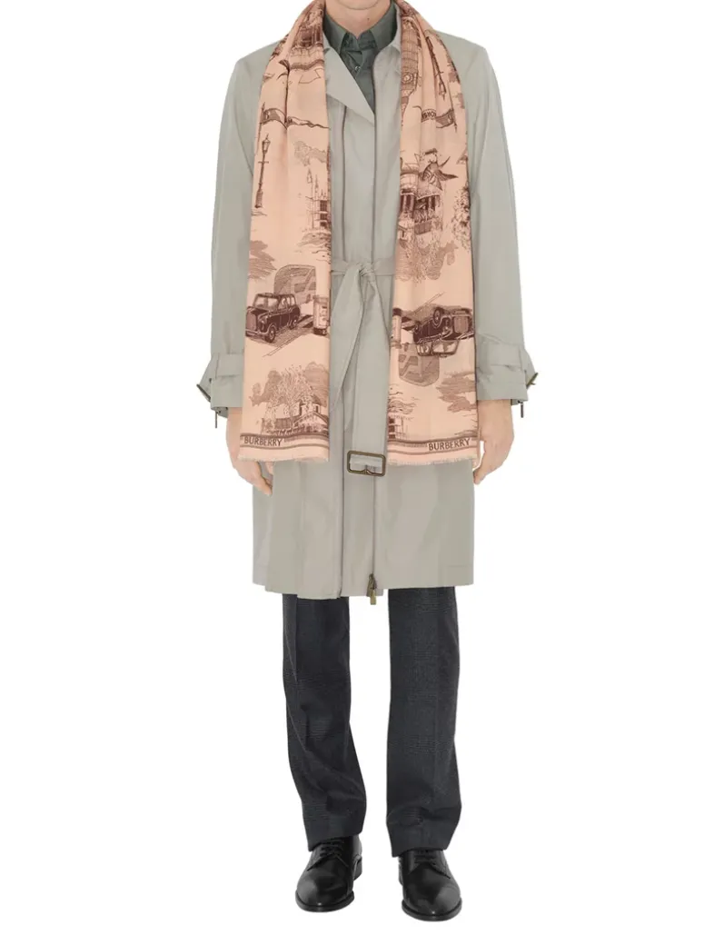 A lightweight scarf made in Italy from wool silk. The design is printed with hand-drawn artwork depicting iconic London landmarks including the Houses of Parliament, Tower Bridge, Trafalgar Square and our Horseferry House headquarters.