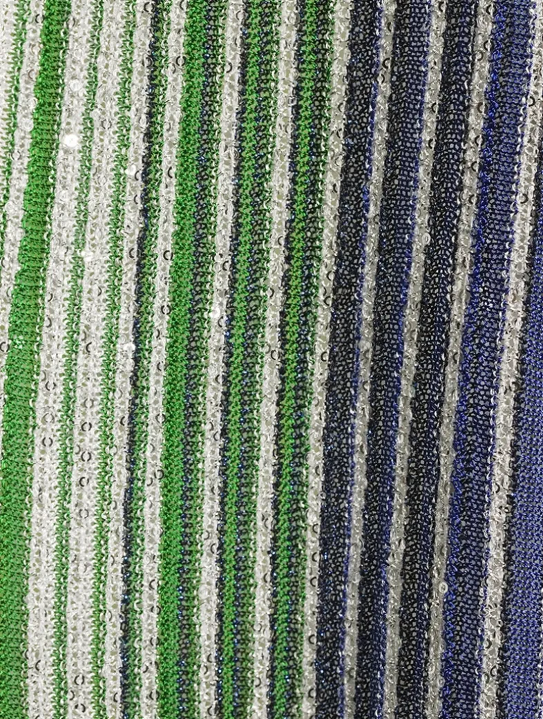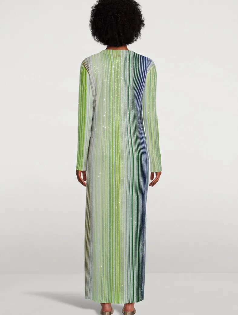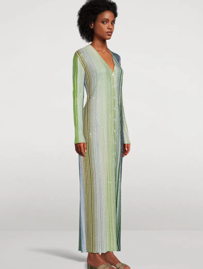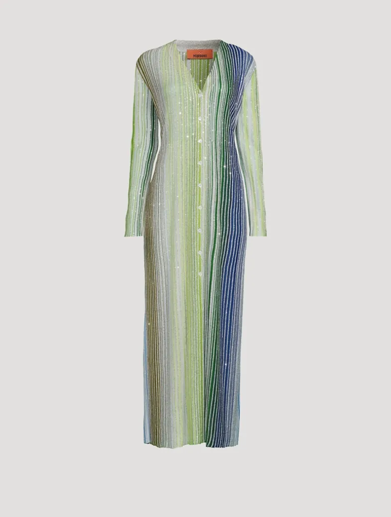 Adorned with a shimmering sequins, this ankle-grazing sweater flashes with every movement. This button-front cardi is knit with horizontal stripes in a dégradé colouring.