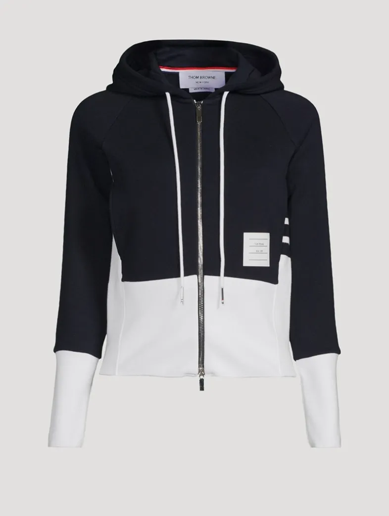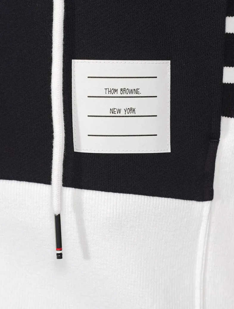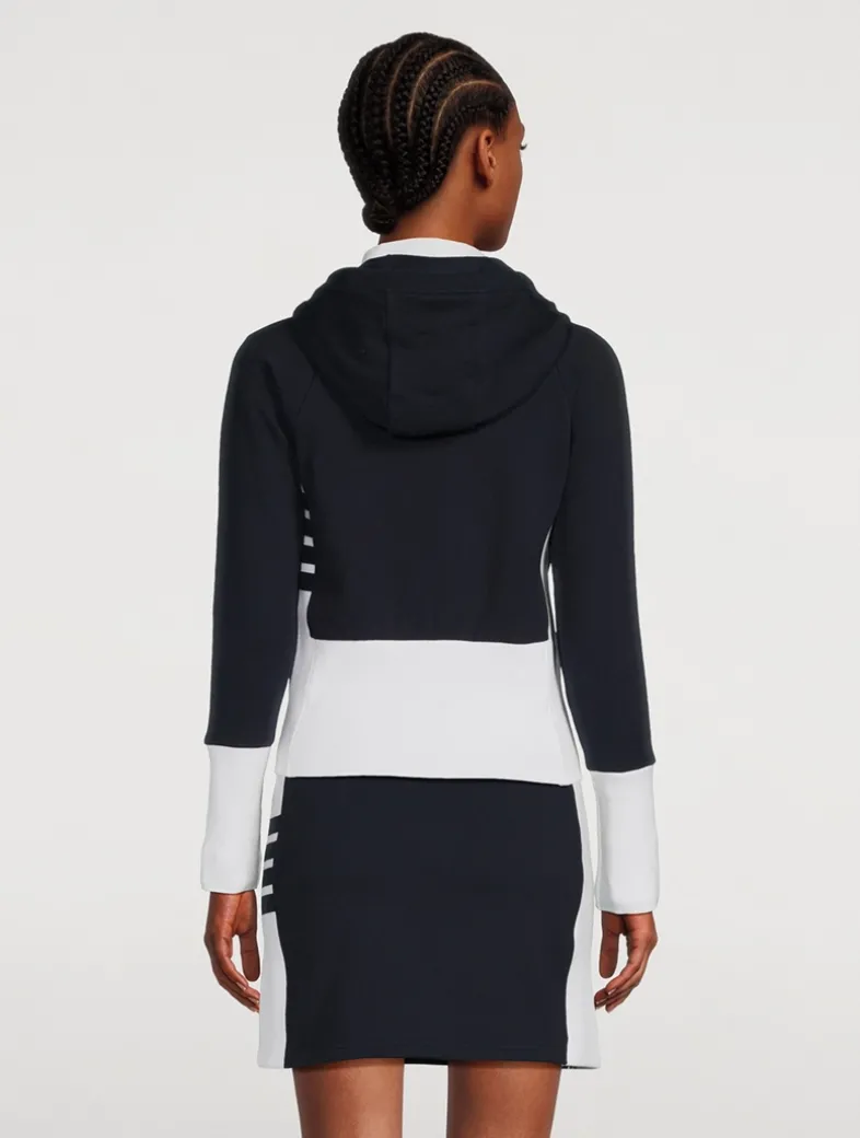 Drawing inspiration from Thom Browne’s sporty heritage, this ultra-comfortable jersey sweatshirt is perfect for active days or relaxing in style. Made from breathable cotton fabric with a drawstring hood, four-bar detailing, and name tag appliqué.