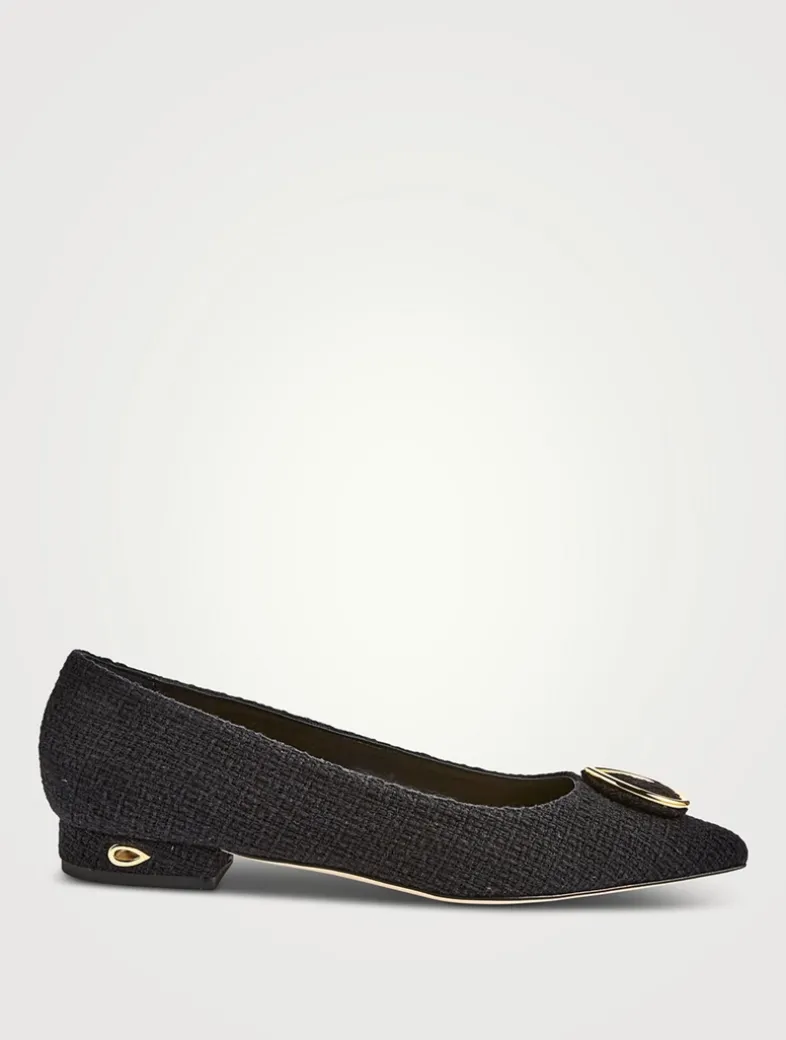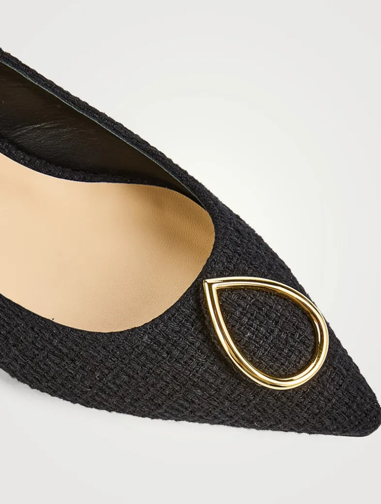 Offering everyday polish as well as an ultra-comfortable evening option, the Lorenzo Flat brings together an elegant pointed toe with a 20mm mini lift heel. Handcrafted in tweed by meticulous Italian artisans. Featuring Jennifer Chamandi’s iconic, patented ‘Eye of the Needle’ heel, the Lorenzo Flat can be worn two ways: with or without a strap threaded through the eye of the needle and buckled across the foot.