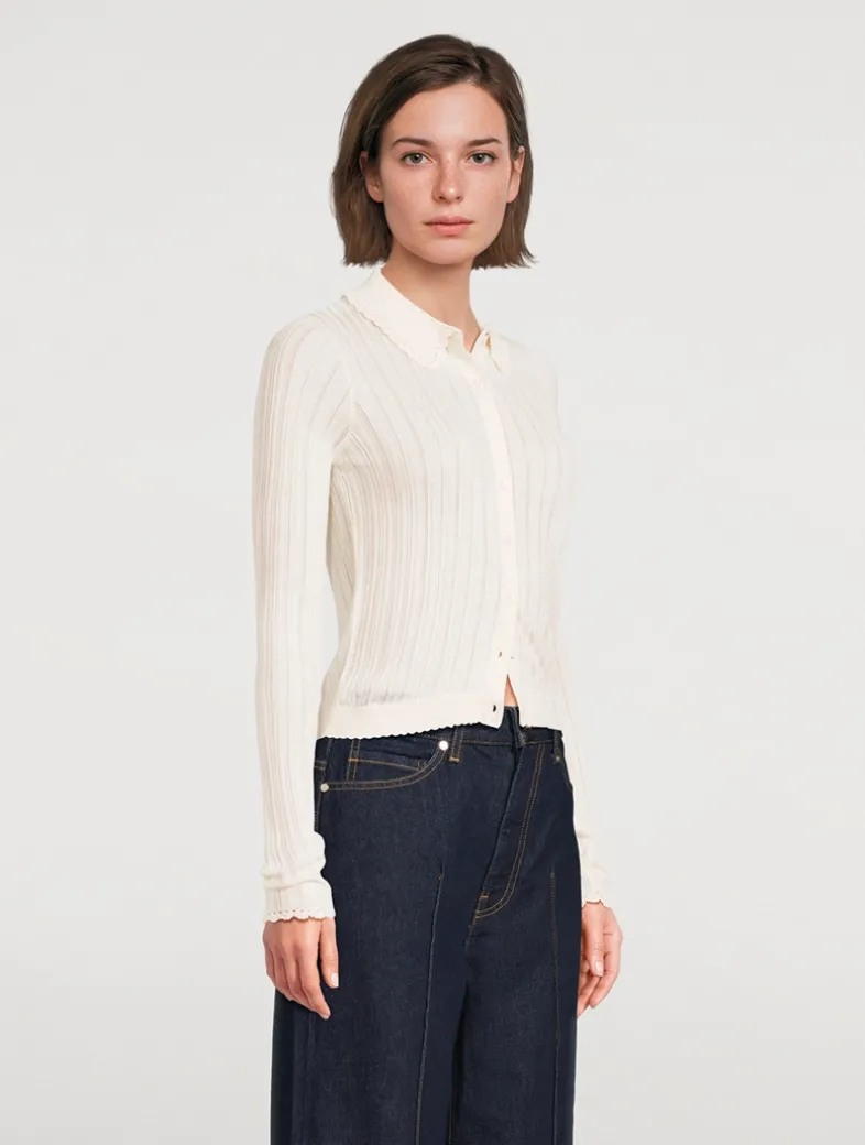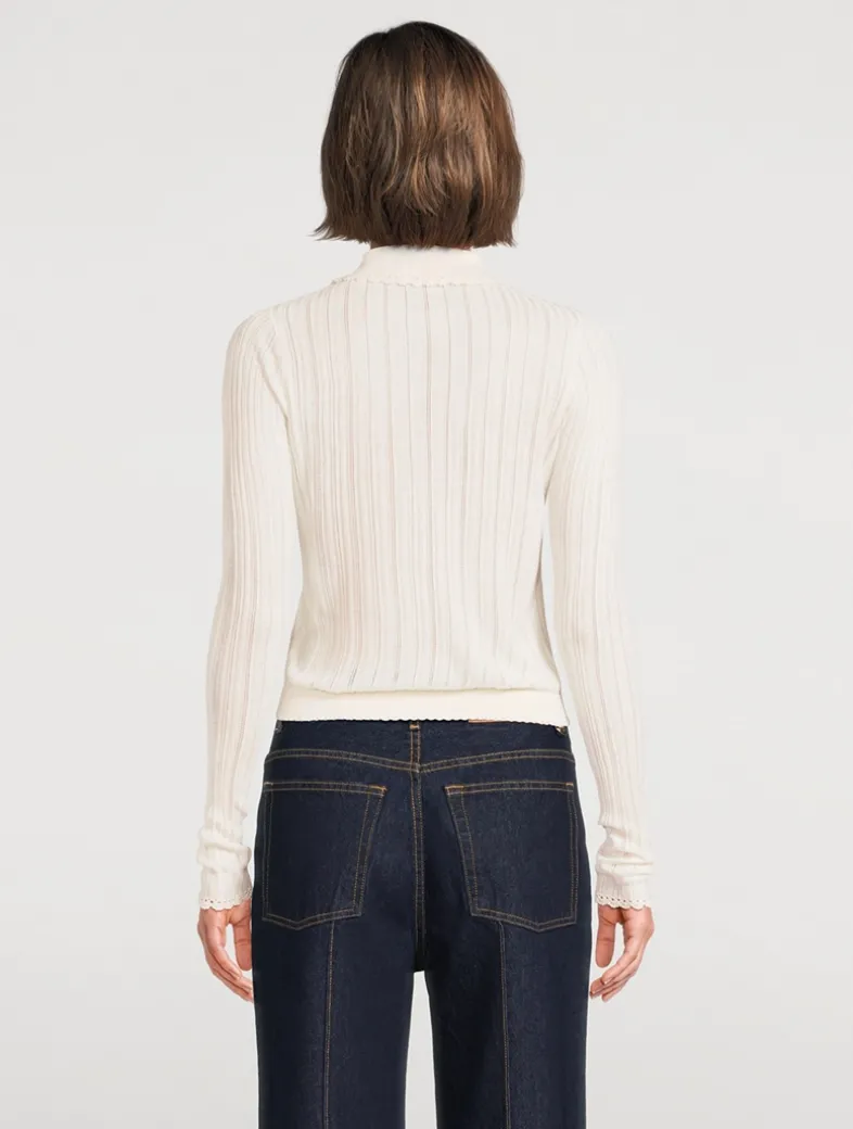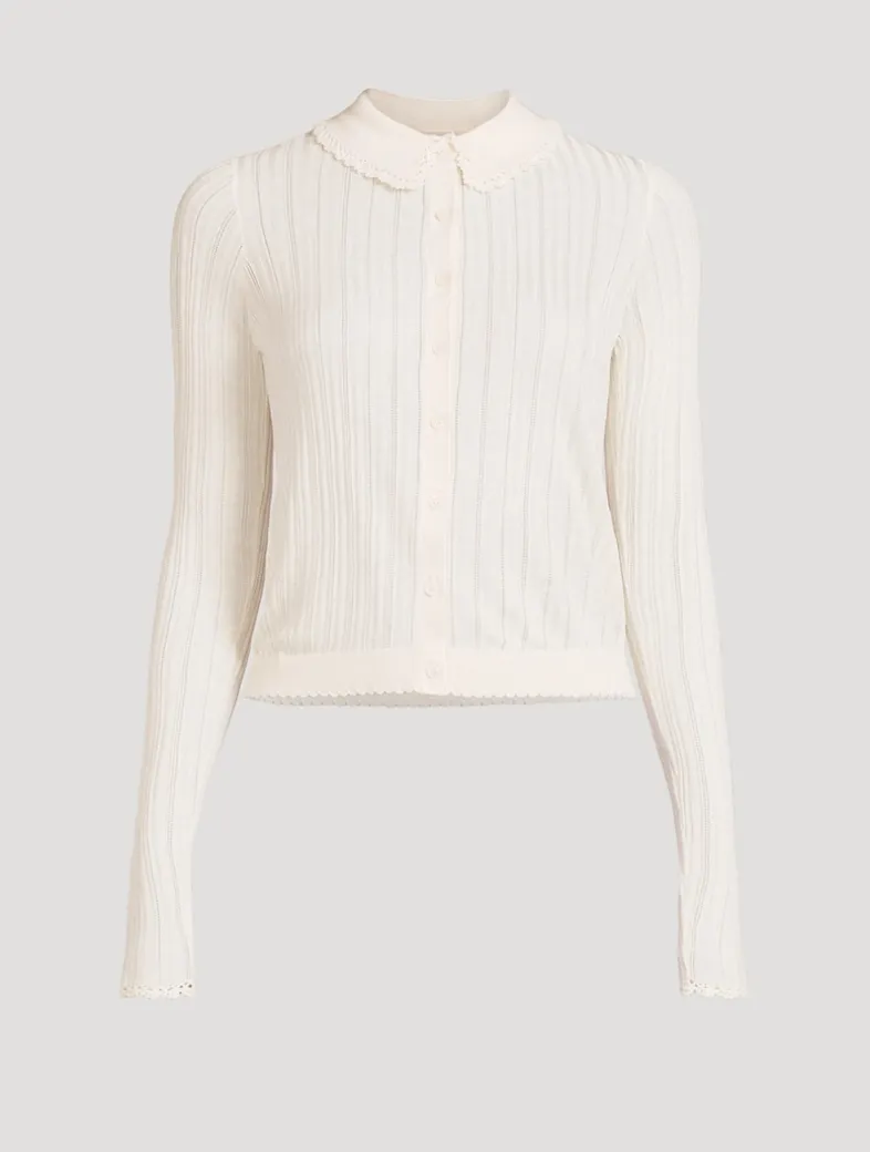 Elegant ease arrives in the Lottie Cardigan, knit from a lightweight pointelle with openwork that subtly reveals. This long-sleeve essential has a slim fit for layering, a classic collar, and is finished with delicate, hand-crochet trims at the edges for an artisanal touch.