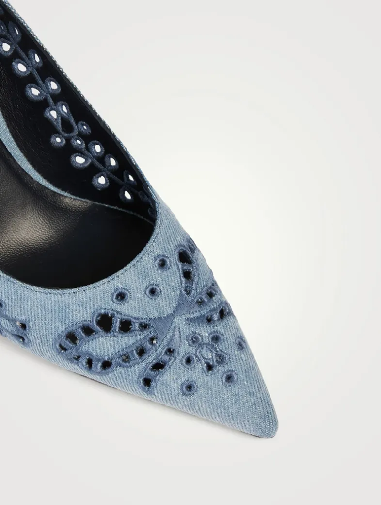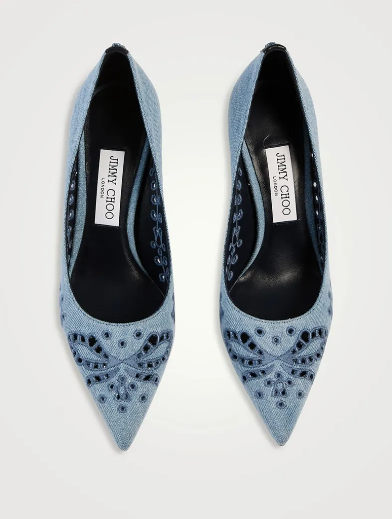 The iconic Jimmy Choo silhouette is updated with tonal Sangallo embroidery and dainty cut-outs. This pair, set on a slim 85mm heel, is designed with a dramatic pointed toe, and cut higher on the foot, allowing for more coverage.