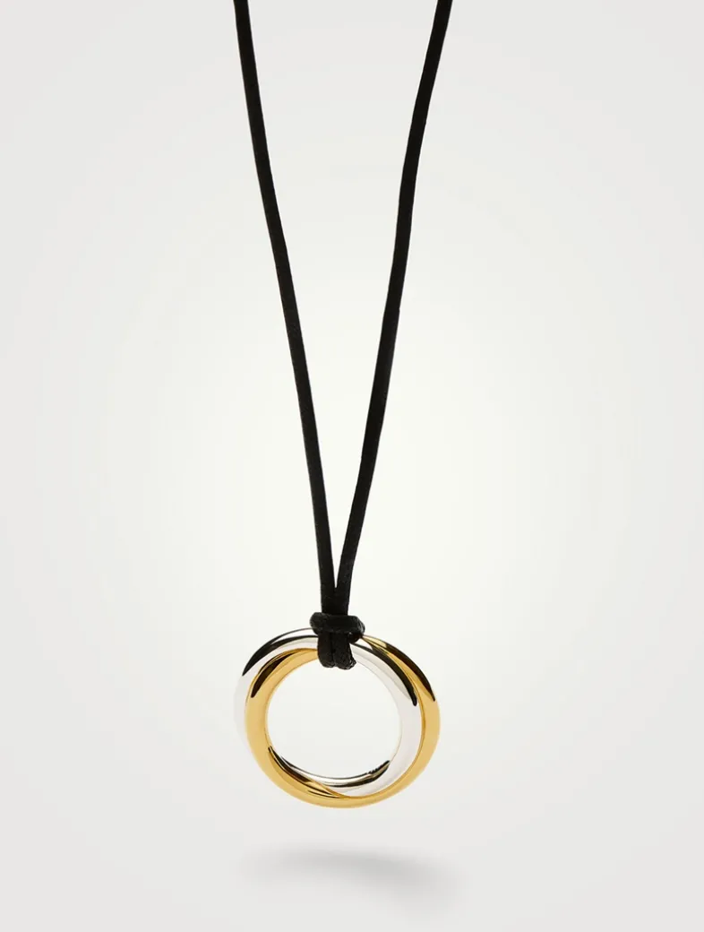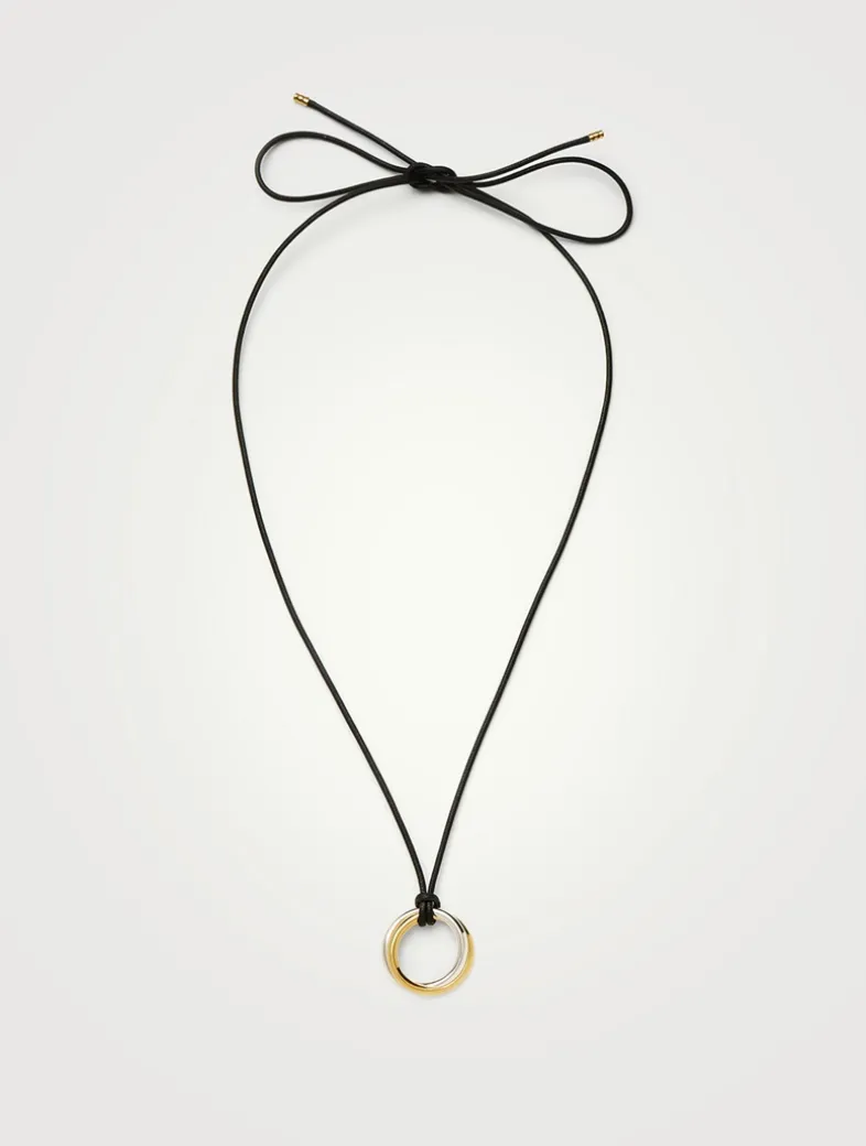 A classic, reimagined. Inspired by the Lucy Williams Entwine Necklace, a mixed metal round pendant is combined with a long black cord necklace to create a distinctive finish. The cord can be tied at any length, doubled up as a choker, or worn long.