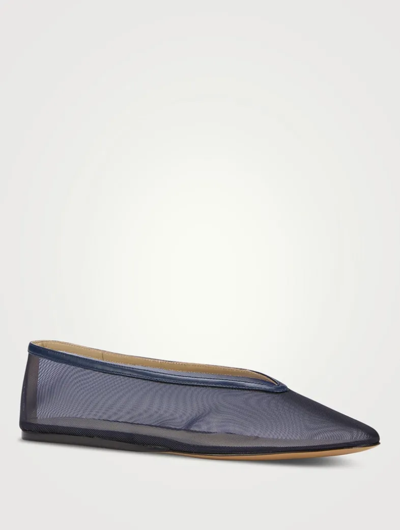 Crafted in a delicate metallic mesh, these flats are designed with a cushioned calf leather insole and leather piping. They have a rounded square toe finished with a V-cut vamp. Made in Italy.