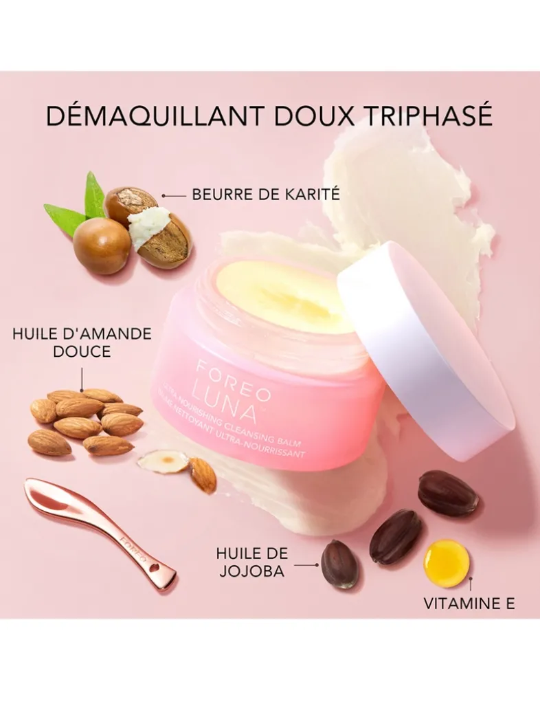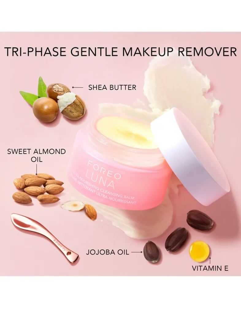 The lightweight tri-phase LUNA™ Ultra Nourishing Cleansing Balm is an ultra-nourishing, non-clogging balm-to-oil that gently removes makeup instantly and clears even waterproof cosmetics in seconds. Use the clean, vegan, cruelty-free formula daily as a quick and effective makeup remover or to effortlessly refresh the complexion for a nourishing deep cleanse. It features 77% naturally-sourced ingredients to leave skin soft, hydrated, and super comfortable for a perfect non-stripping cleanse. Use alone or as the first step of a double cleansing routine followed by a water-based cleanser such as FOREO’s Micro-Foam Cleanser.