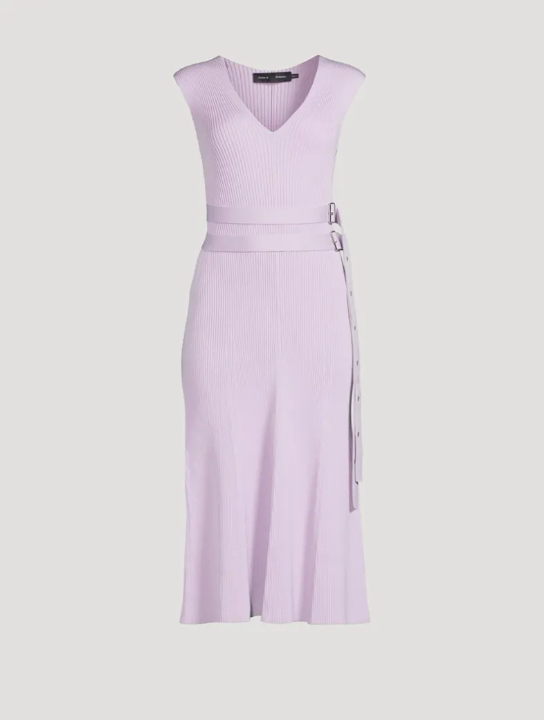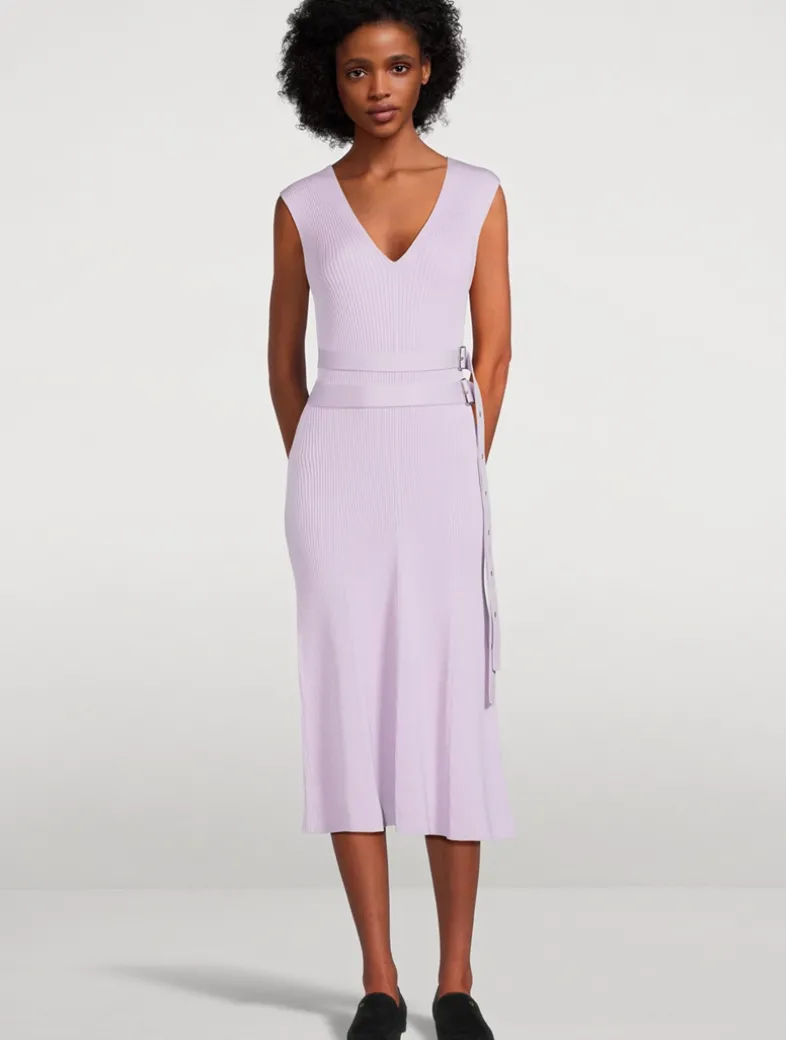 Adorned with a rib-knit texture, the Madeline Dress features a slim V-neck silhouette with a tonal double belt, accented with silver-tone grommets at the ends and a slider buckle.