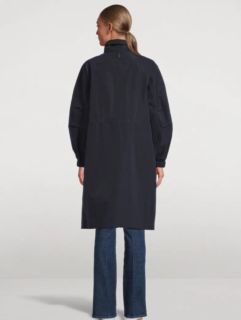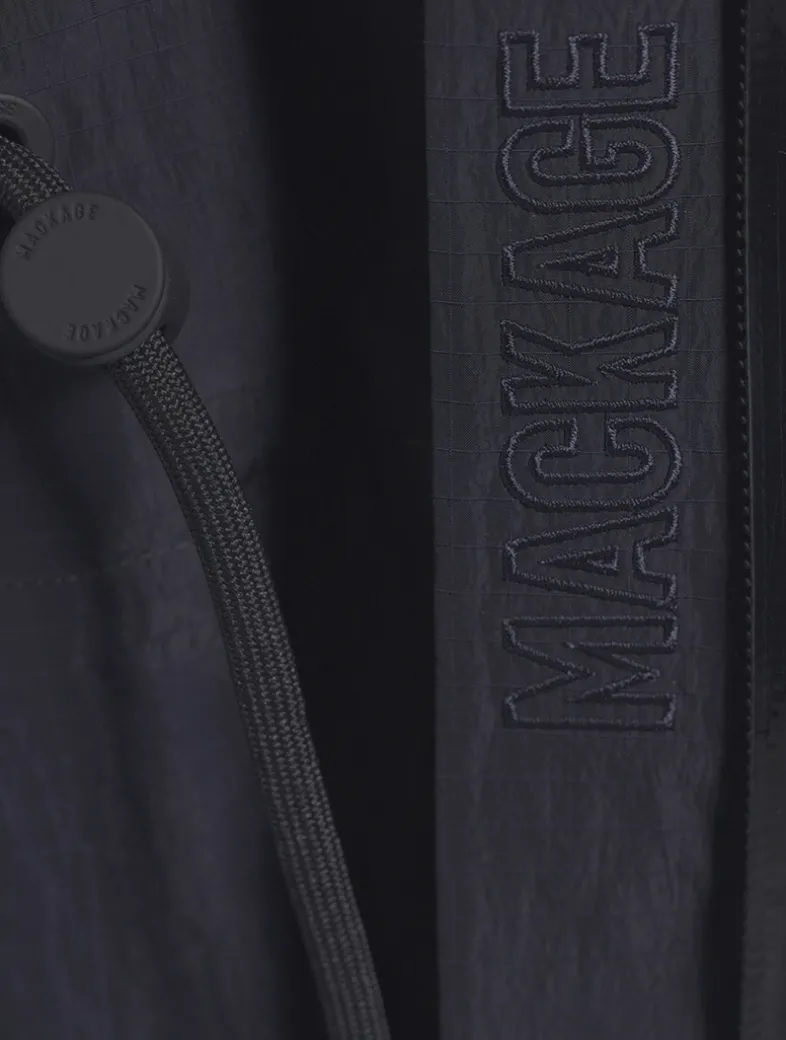 Makayla is a lightweight ripstop, knee-length rain jacket crafted from recycled materials for sustainable style. Featuring a hidden hood inside the collar, water-resistant zippers, and a streamlined front placket with snaps for water-repellent coverage. An adjustable drawcord waist and elasticized cuffs enhance fit and comfort, while dual patch pockets provide practical functionality. Finished with tonal MACKAGE embroidery along the placket for an understated branded touch.