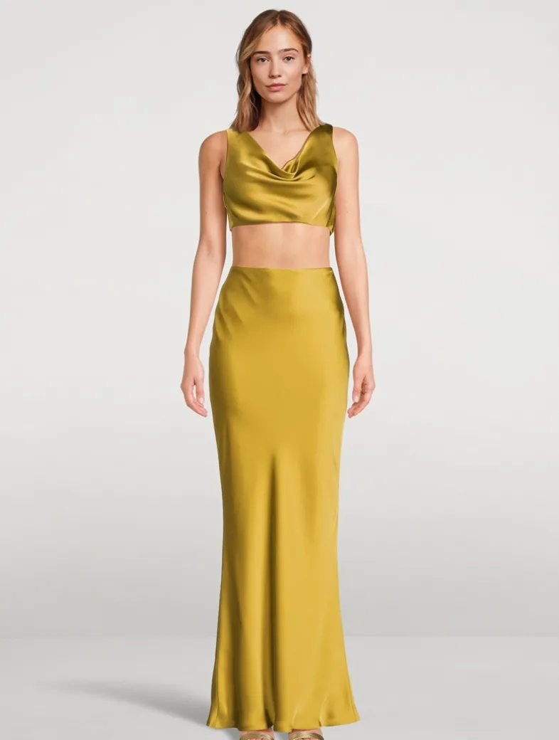 With a cowl neckline and draped back and crafted from silky satin, this skin-baring sleeveless top exudes a glamorous feel.