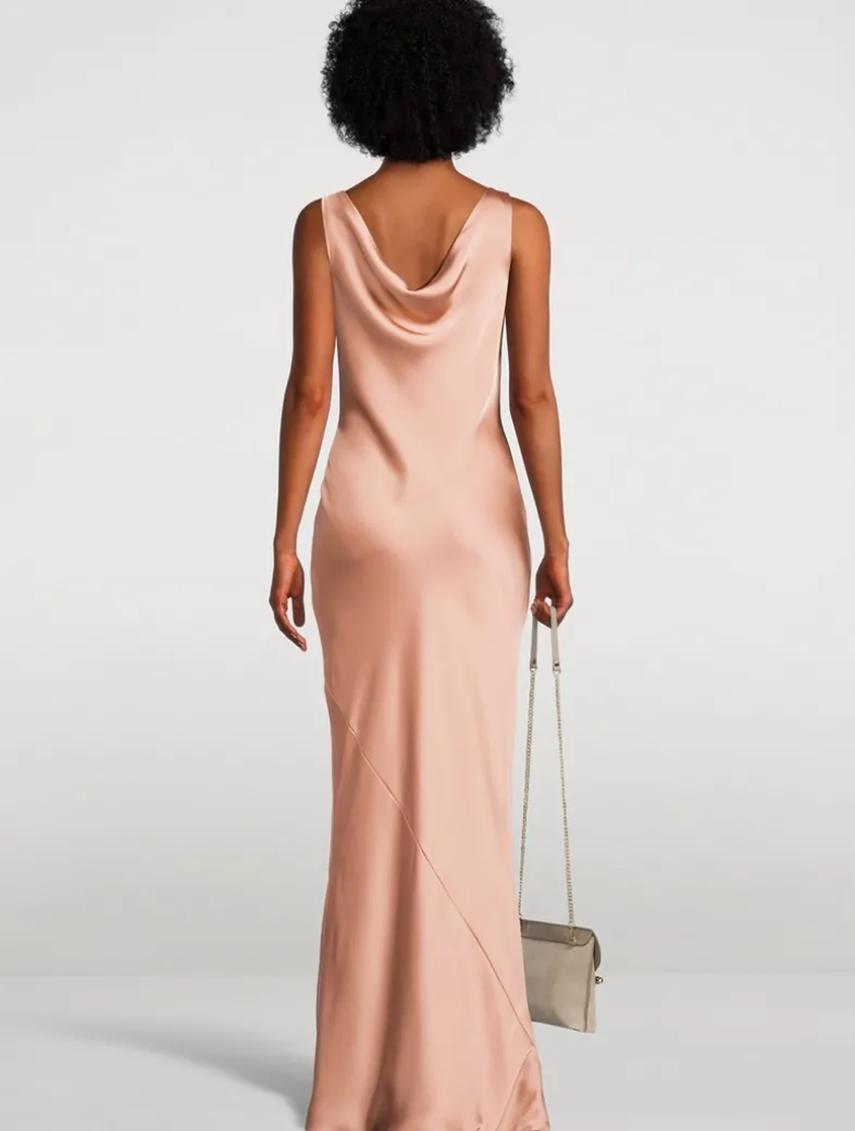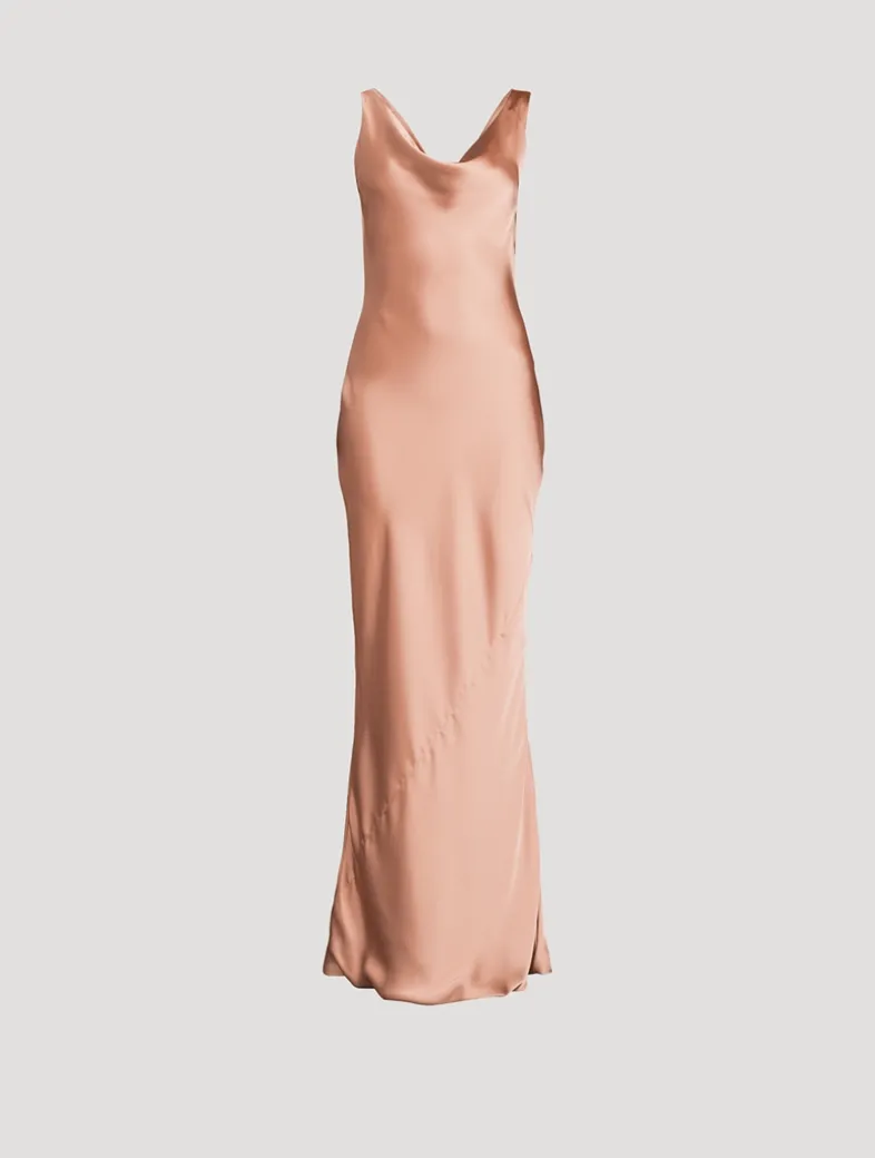 With a cowl neckline and back, this sleeveless dress is a classic. Cut on the bias, the silky satin fabric falls to a floor-grazing length for a beautiful evening look.