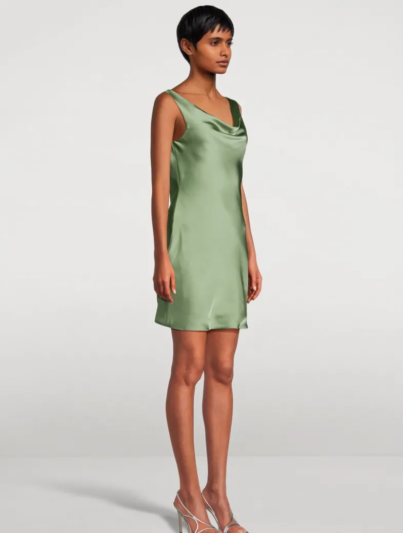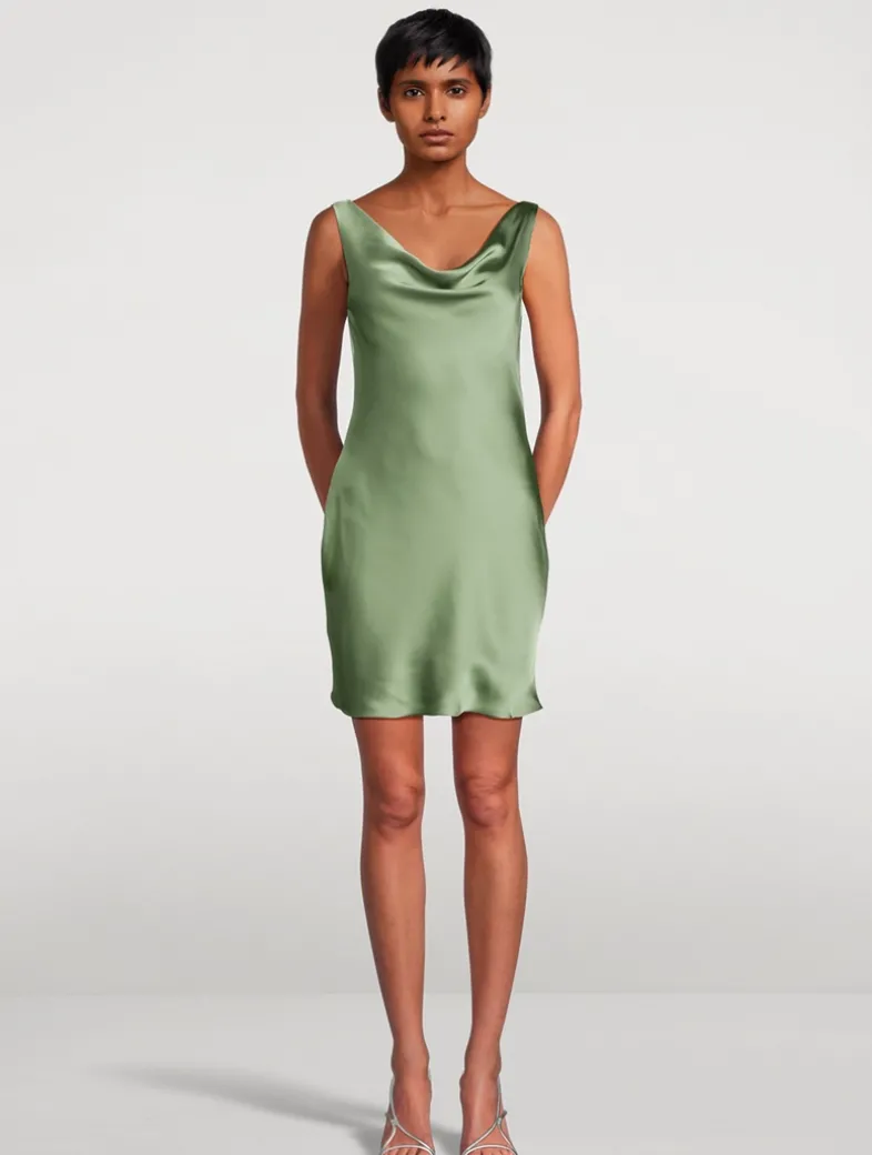 With a cowl neckline and back, this sleeveless dress is a classic. Cut on the bias, the silky satin fabric falls to a mini length for a sensual look.