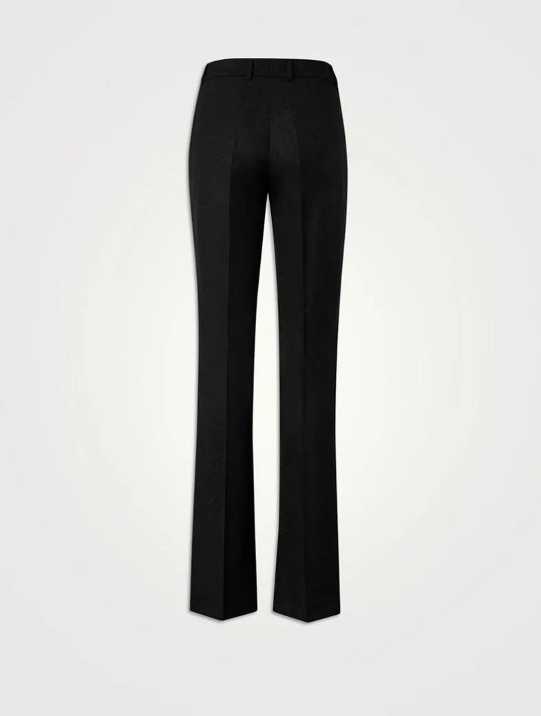 These trousers are crafted in a wool flannel with a hint of stretch for the perfect fit. They have a leg-lengthening silhouette with a bootcut leg, side zippered pockets, and belt loops at the waistband.