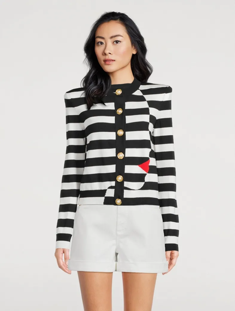 Blending a Parisian-inspired charm with nautical details, this long-sleeve sweater has a striped design with a face profile at the front. It has a high crew neckline and six