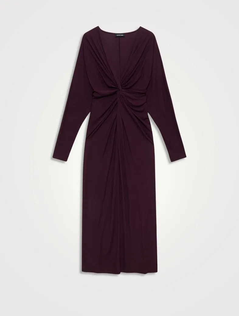 Crafted from an unlined, midweight viscose-jersey blend with a smooth, drapey feel and subtle sheen, this elegant silhouette features a deep V-neckline, knot detailing at the centre-front waistline, and long dolman sleeves. Cut for an oversized fit that is slightly tapered from the hips down with a midi-length hemline.